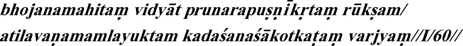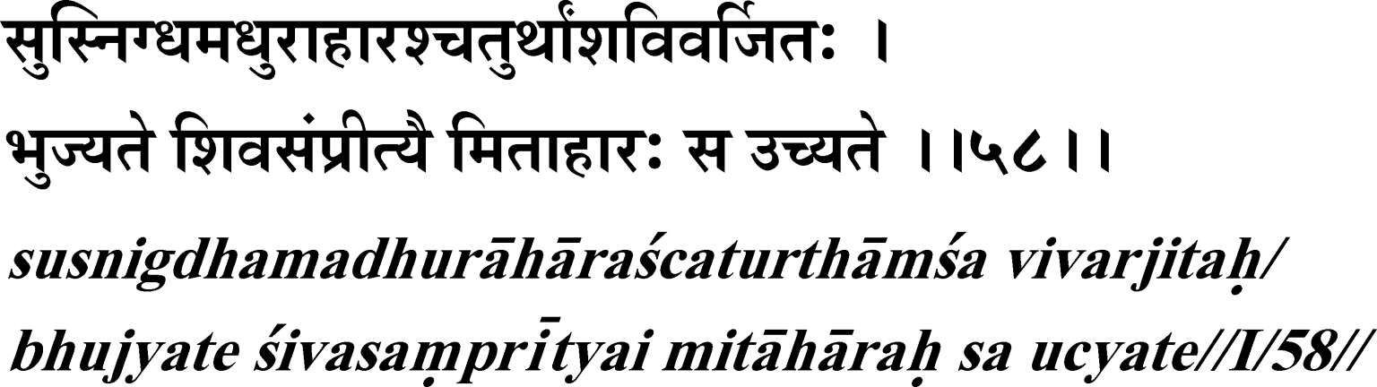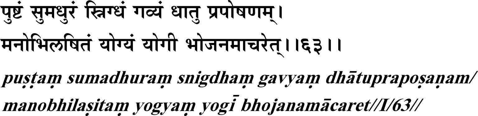 瑜伽士应该食用有益于健康的食物,如甜的、润滑的、牛奶做的、对(身体的)基本元素有营养的、适合个人口味或心意的,以及有益的和满足(瑜伽食物之)所有条件的食物。