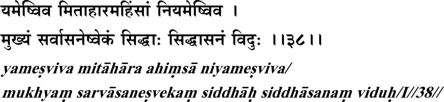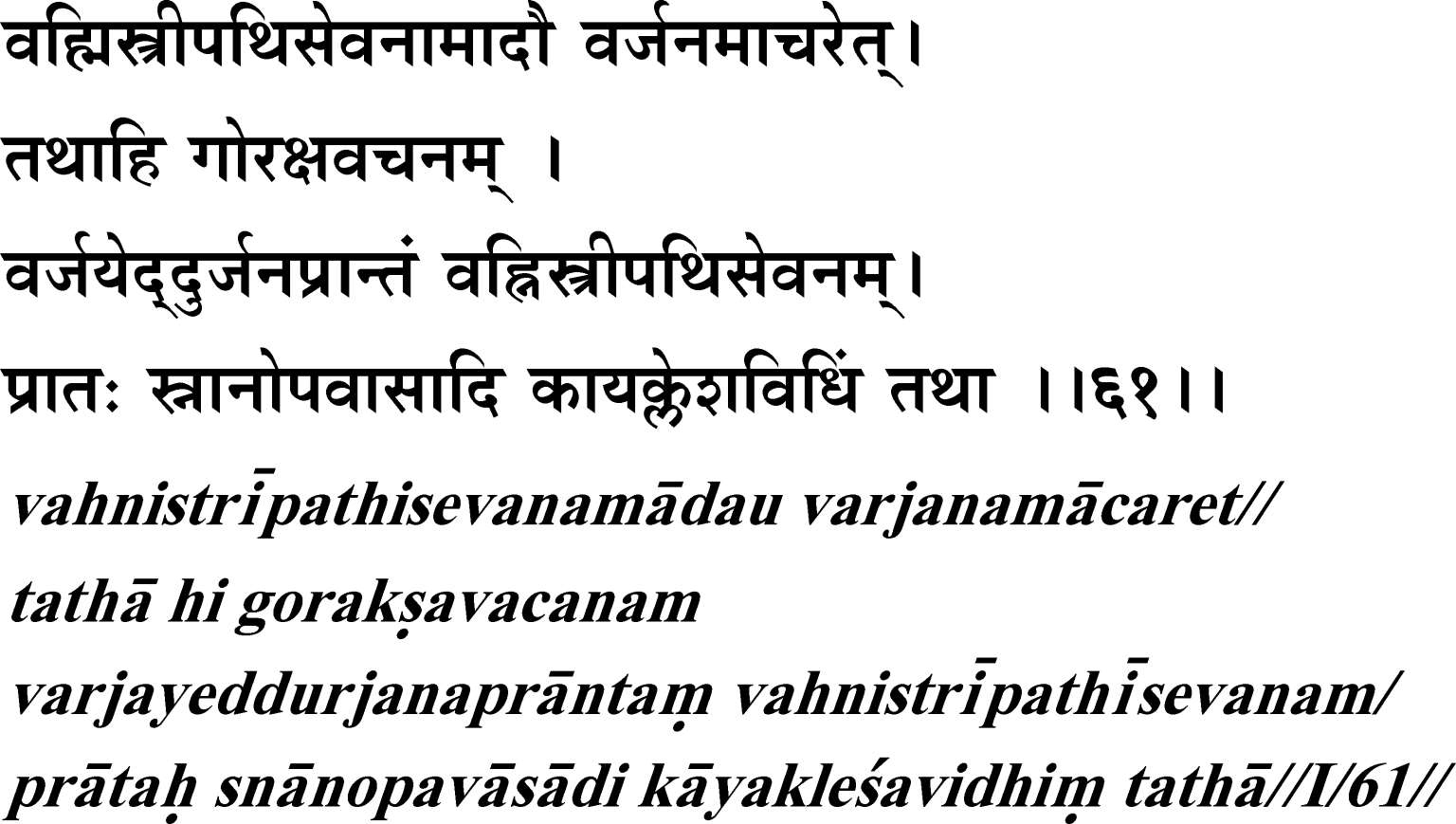 人们常常责备哈达瑜伽没有强调行为准则的重要性,而行为准则就是众所周知的瑜伽术语禁制。的确,哈达瑜伽没有列举出如帕坦伽利描述的禁制,也没有把禁制作为哈达瑜伽的一支,但是,并没有充分的证据可以推论说哈达瑜伽不强调行为准则的重要性。我们应该记住,禁制这一术语并不比禁制的内容更加重要。到目前为止,斯瓦特玛拉摩已经涉及了禁制的内容。毫无疑问,他认为这些禁制的内容是重要的。这里,“梵行具足”这一词语清楚地表明,除非练习者遵守此行为准则,否则就不可能取得瑜伽的成就。