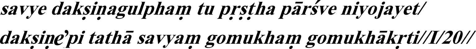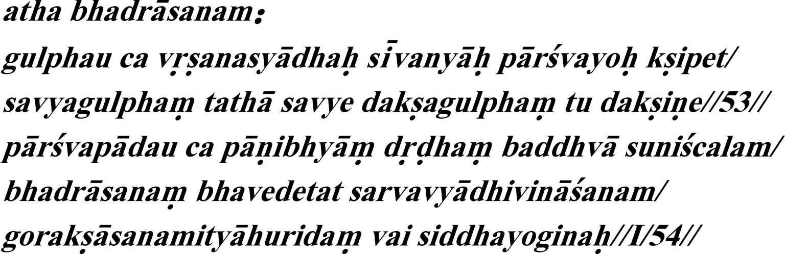 (3)治疗效果。我们发现,有两个定义表明了体位的治疗性能:《哈达瑜伽之光》说,体位将带来健康(arogyam);《高拉夏夏塔卡姆》则明确提出,体位的治疗价值是消除疾病(asanena rujo hanti)。
