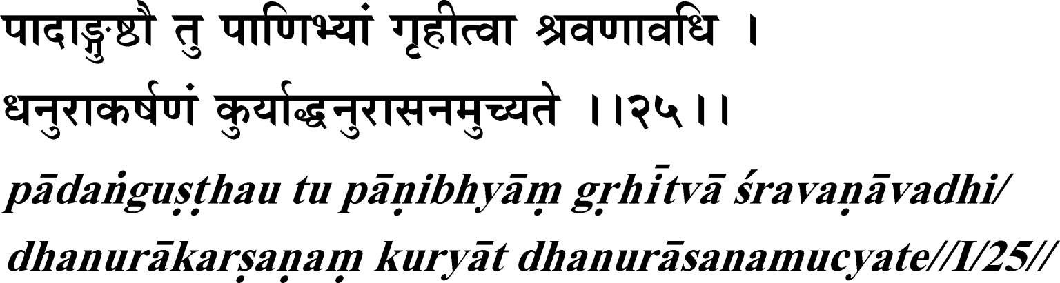 “Dhanu”的意思是弓。其最终姿势形成的身体,就像一张弓。这一体位也被称作Dhanurakarsan式,即开弓式。因为它就像一张拉开的弓。这一节描述了两种技巧。