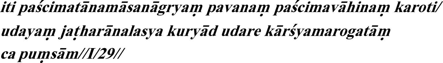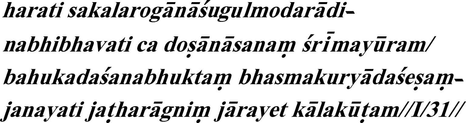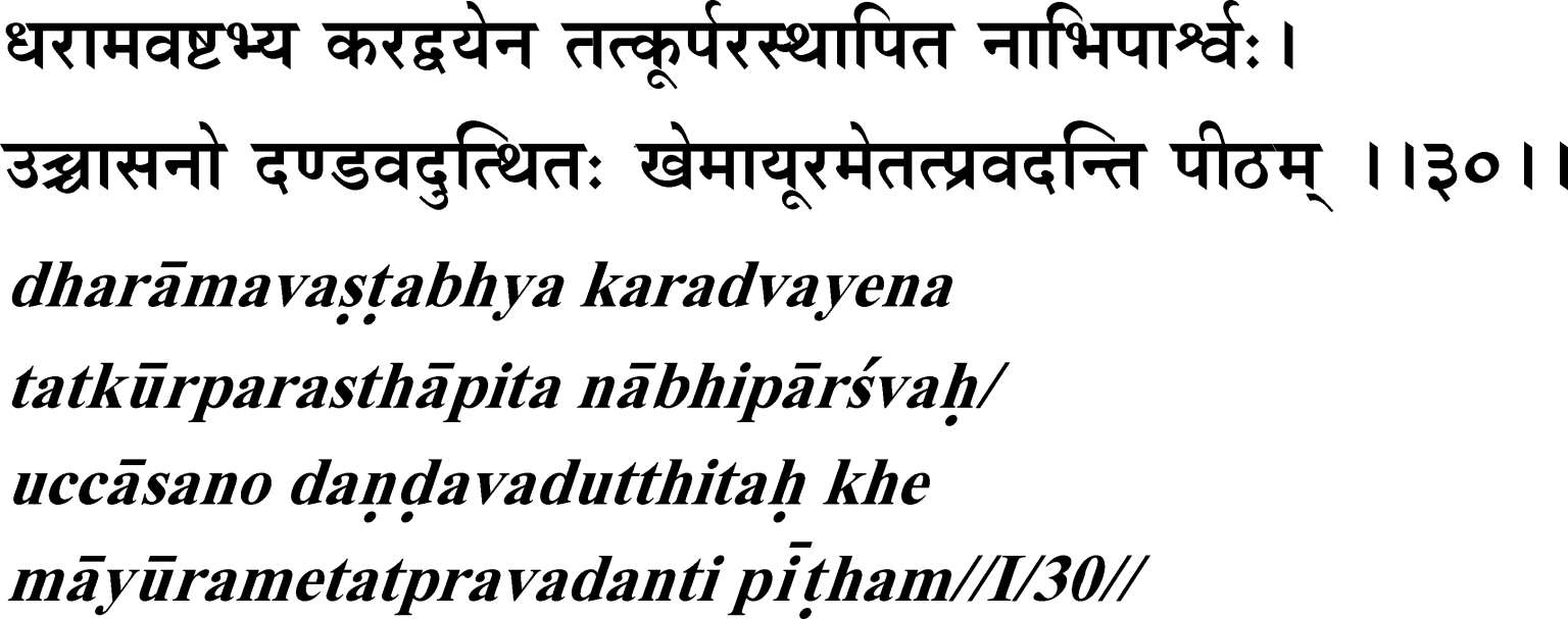 孔雀式是最为平衡的体位之一。在其他文本中,我们也发现了这一体位。《踹希克亥婆罗门乌帕尼萨》( Trishikhibrahmano panisad )的曼陀罗部分(4748),用举起头和腿这些词更加清楚地描述了这一体位,清楚地暗示了除了双手外,身体的其他部位都不接触地面,整个身体依靠双手维持平衡。我们在《哈达罗纳瓦利》( Hatharatnavali ,III/44)中发现了孔雀式的其他变体。根据《哈达罗纳瓦利》一书的作者室利尼瓦萨(Srinivasa)的说法,斯瓦特玛拉摩描述的这一技巧称为棍棒孔雀式(Danda Mayurasana)。斯瓦特玛拉摩对这一体位的益处的描述似乎言过其实了,但它非常重要。与消化系统有关的大部分器官都在腹腔中、在肚脐的周围。这一体位给予这一区域有力的压力,导致这一区域与消化系统有关的器官更好地发挥功能。本节肯定了它的这一作用。它抵御腹腔内的疾病,消除体液失衡,甚至因为强有力的胃火(消化力)而彻底消化有害身体的食物。假设中毒了,也可以解除毒素效力。然而,这并不意味着,练习孔雀式就可以服毒。这一体式的效果不过意味着,甚至那些不能正常消化的食物,因为这一体位的效力能得到消化。