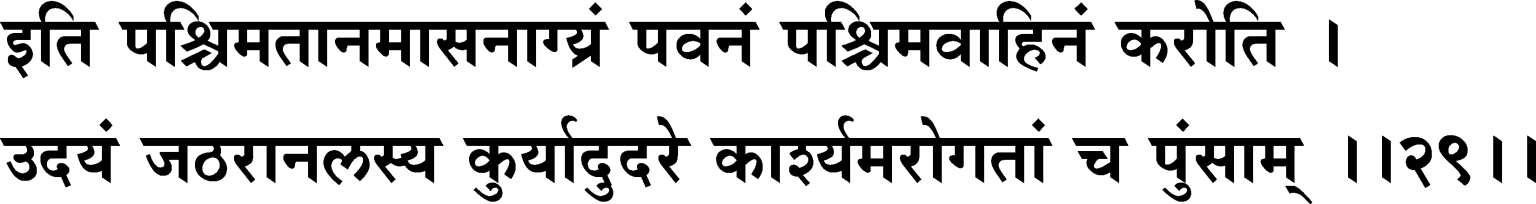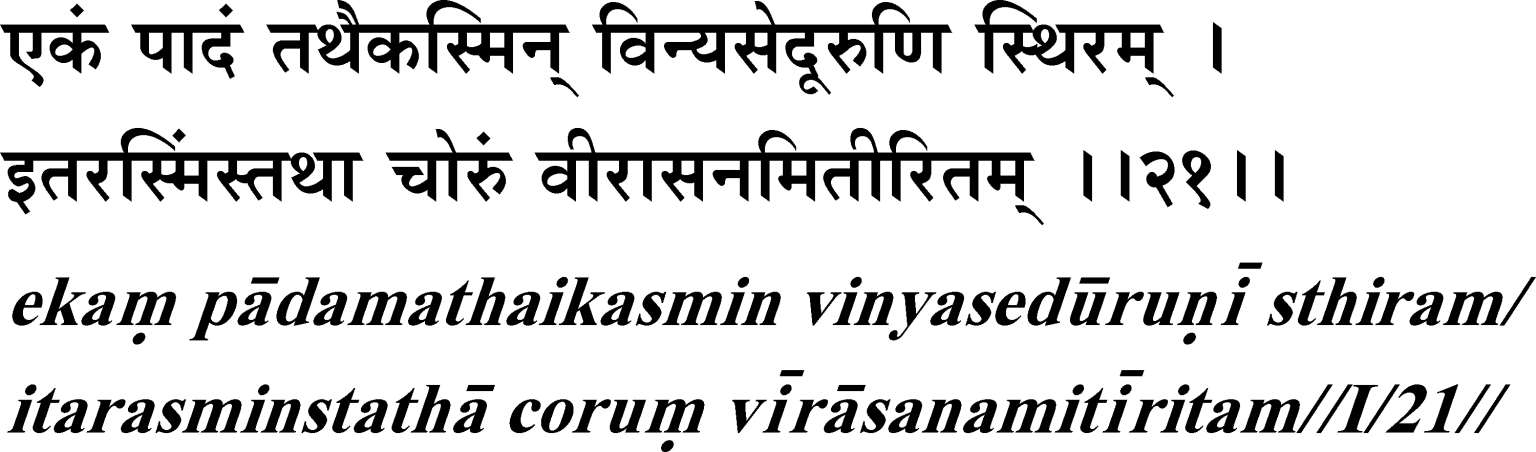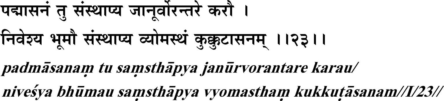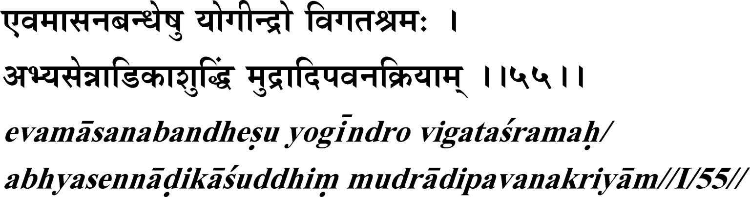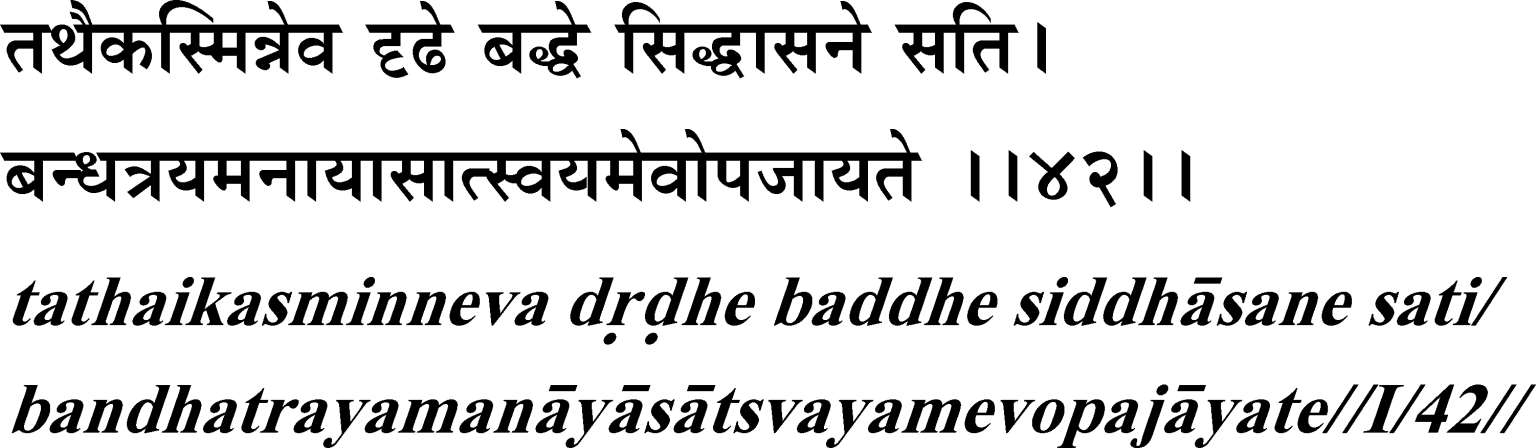 这样,通过各种不同的体位,伟大的瑜伽士在消除了疲劳之后,练习经脉净化以及与生命气有关的练习如身印等。