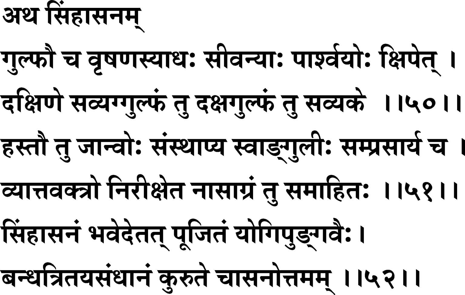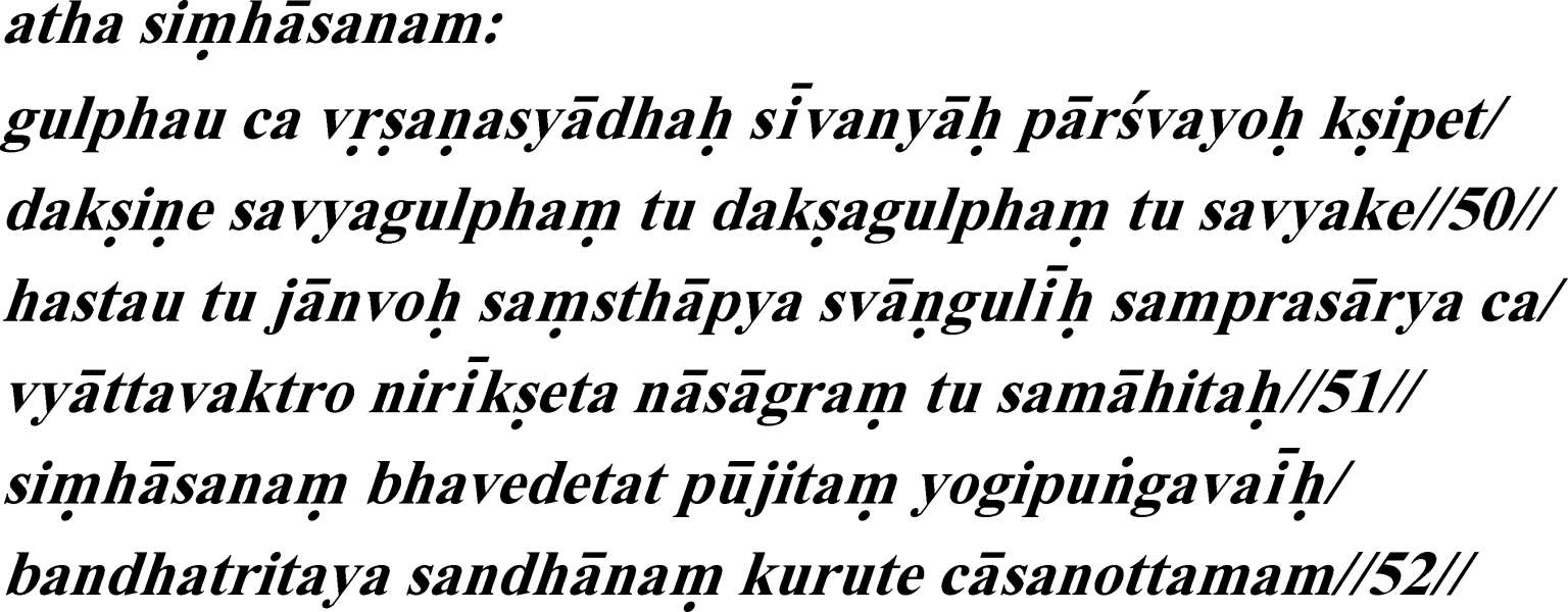 这就是狮子坐(Simhasana),伟大的瑜伽士们所推崇的体位。它有助于形成三锁印,是所有体位中最好的。
