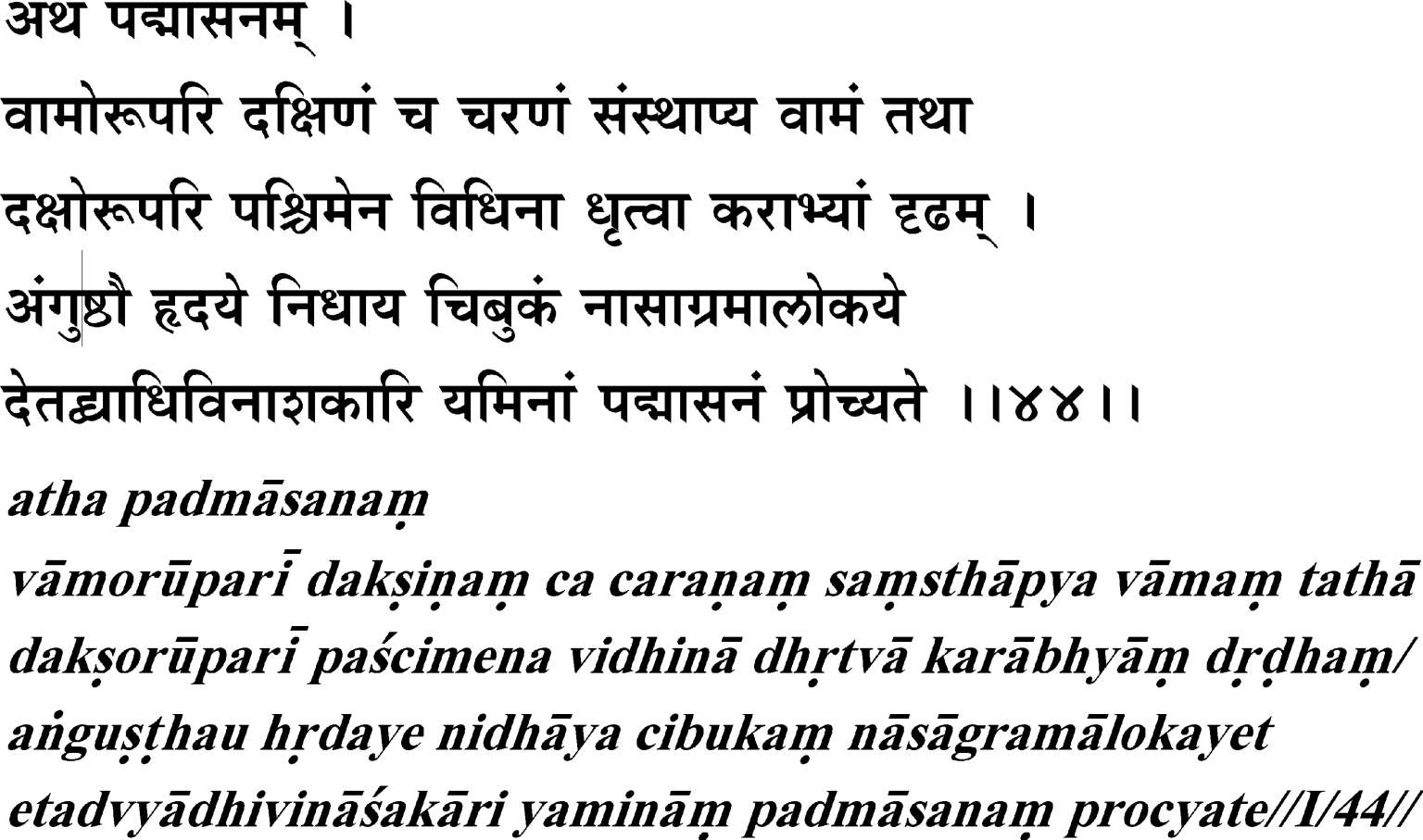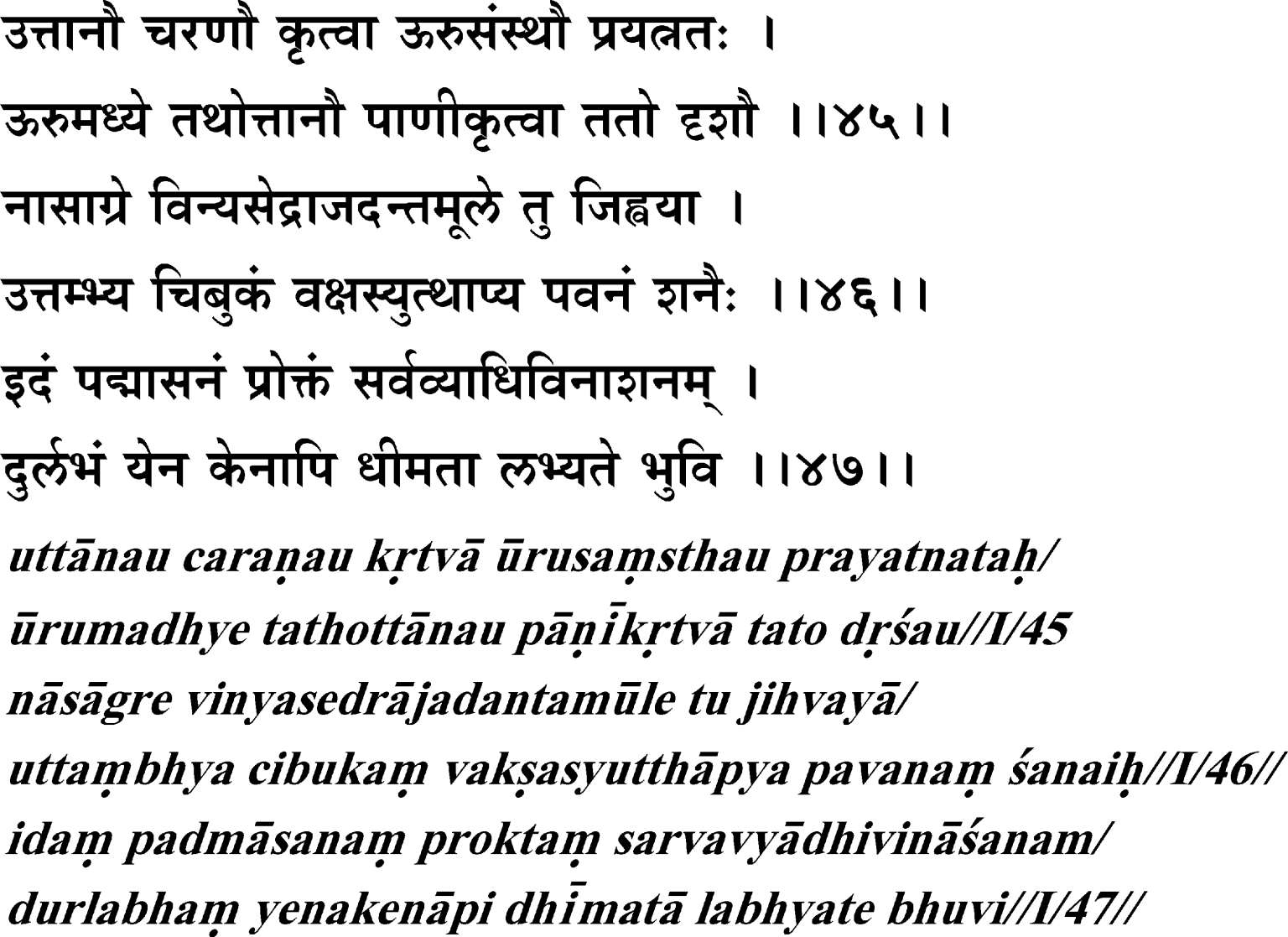 Padma的意思是莲花。这一体位最终的姿势是,脚掌放在对侧大腿上,脚掌心向上呈现为莲花的花瓣。故此得名。这一体式,斯瓦特马拉摩描述了几个技巧。