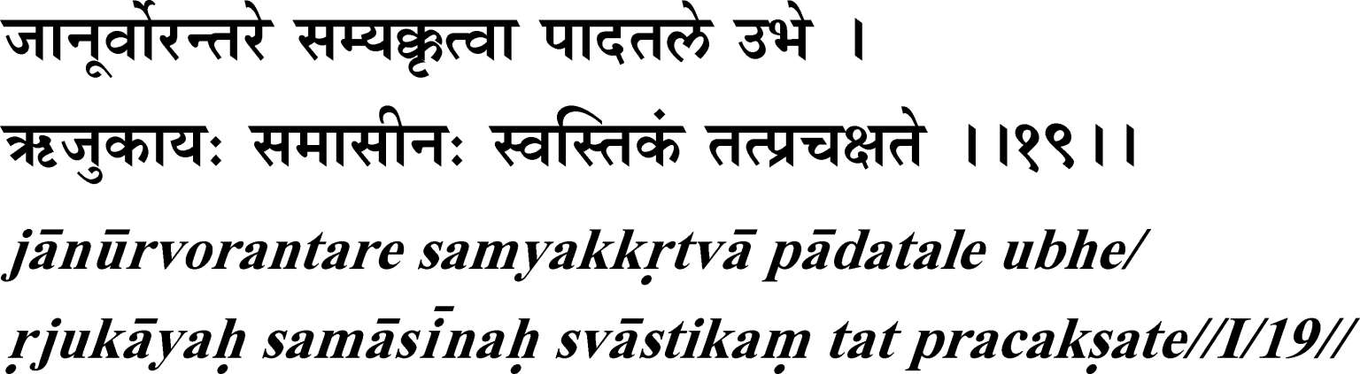 在传统上,万字吉祥坐被认为是有益于更高级的瑜伽练习如调息和冥想的体位。在《雅伽瓦卡亚瑜伽》( Yoga Yajnavalkya ,III/3-5)、《格兰达本集》( II/13)和《瓦希斯塔本集》(Vasistha Samhita ,I/68)中都可以发现对这一体位的描述。《雅伽瓦卡亚瑜伽》描述过两种万字吉祥坐式,其中一种类似于《哈达瑜伽之光》所描述的坐式,另一种坐式是把脚跟放在会阴两侧。(如果双脚脚跟交叉,就类似于《哈达瑜伽之光》I/50中狮子坐体位中双腿的放置位置。如果双脚脚跟分别放置在会阴之侧,这一体位就类似于龟式中双腿的放置位置。)我们在《瓦希斯塔本集》(I/69)中也发现了这第二种体位。