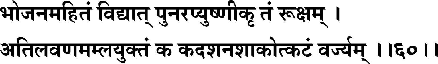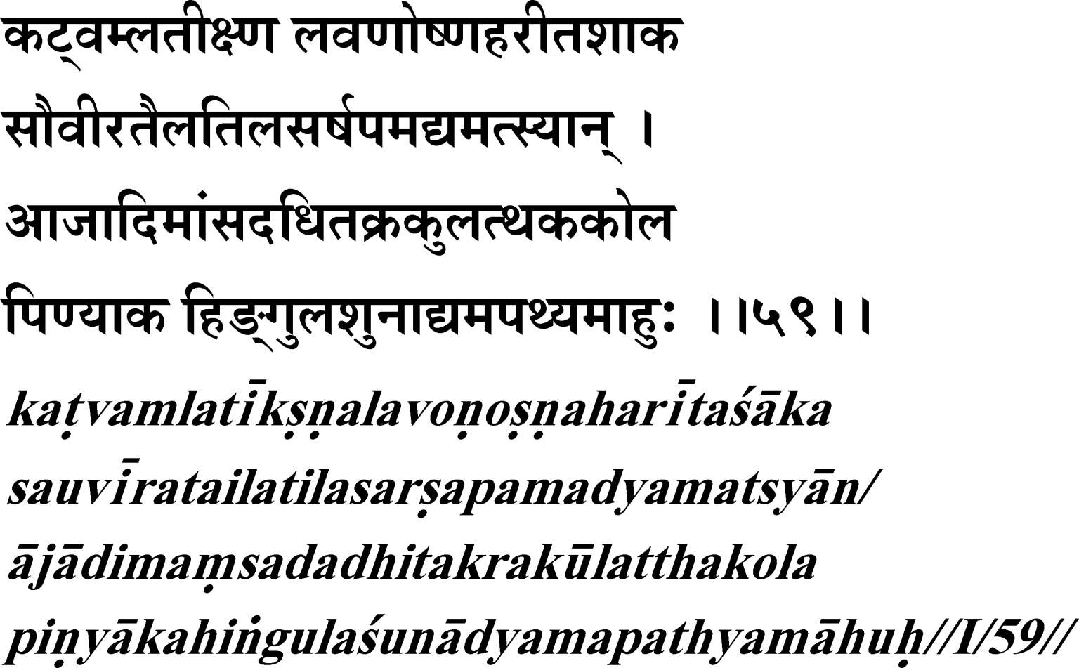 据说没有益处的食物是:苦的、酸的、辛辣的、咸的、热的食物,绿叶蔬菜、酸粥、芥末和芝麻油、酒、鱼、山羊肉等,凝乳、酪乳、枯拉塔哈豆、可乐果、洋葱、阿魏