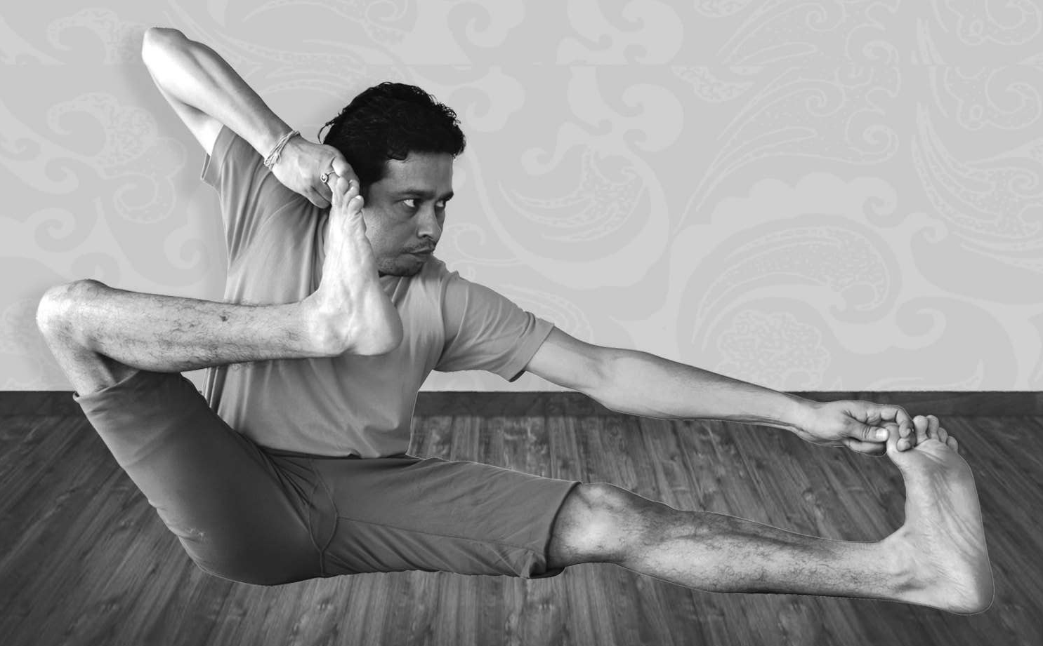 第二种,抓住双脚拇趾,把它们拉近对侧的耳朵。这一体位叫做“Dhanurakarsanan”(开弓式)。