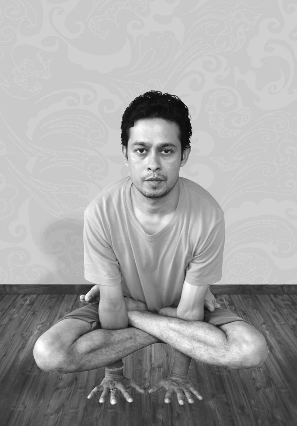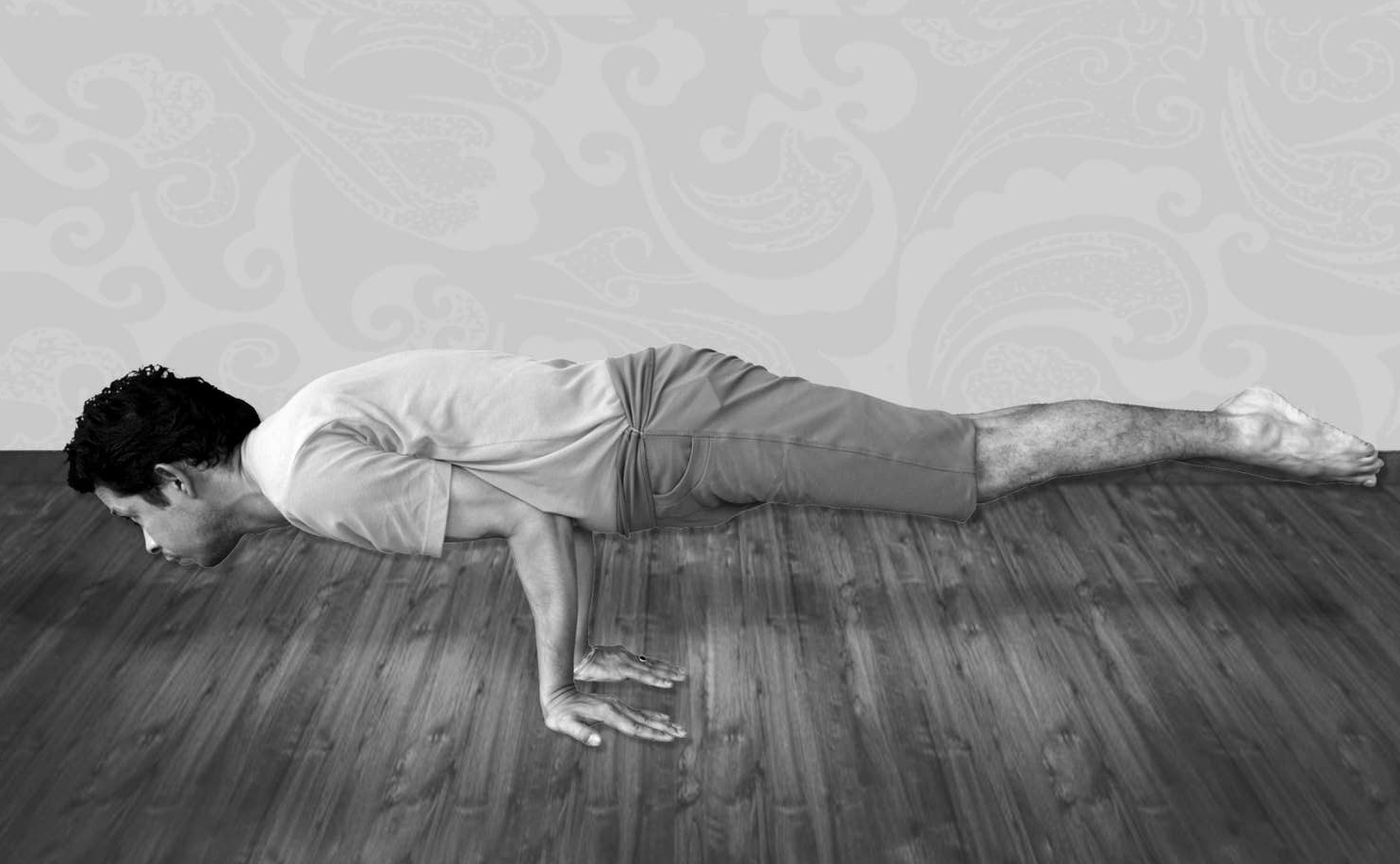模仿孔雀,双手撑地,双肘放在肚脐两侧,将整个身体抬起,就好像一根水平的棍子悬在空中。这就是孔雀式(Mayurasana)。(见图10)