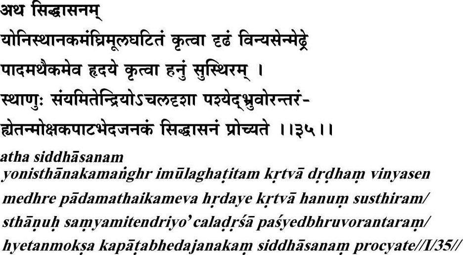 斯瓦特玛拉摩用了九节文字来说明这一体位。这本身就暗示出这一体位在瑜伽课程目标中的重要性。《哈达瑜伽之光》的作者宣称,如果成就了至善坐,就不必练习其他体位了(《哈达瑜伽之光》I/40)。这一体位可以净化所有72000条经脉。由于至善坐,三个收束法(三锁印)——会阴收束法、收颔收束法和收腹收束法——就会自动实现,或者至少有益于它们(《哈达瑜伽之光》I/42)。