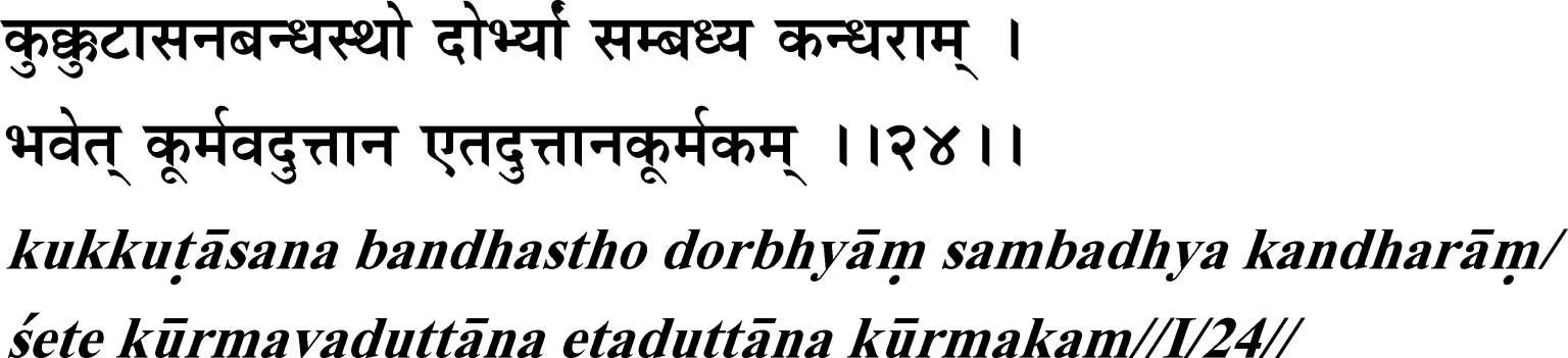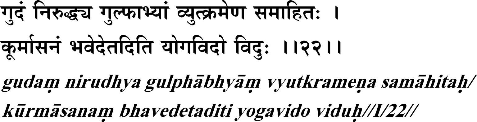 “Kurma”在英语中的意思就是乌龟。这是一个模仿乌龟的很特别的体位,所以被称为龟式。这一体位的最终姿势,从背后看,双腿就好像是乌龟腿。在这里,“samahita”(安然自若地,心意稳固)一词很重要。在这一体位的技巧中,我们也发现了对心的教导——心意稳定。尽管没有提到这一体位的练习效果,但是这一体位对于唤醒位于肛门区的昆达里尼是很好的练习。