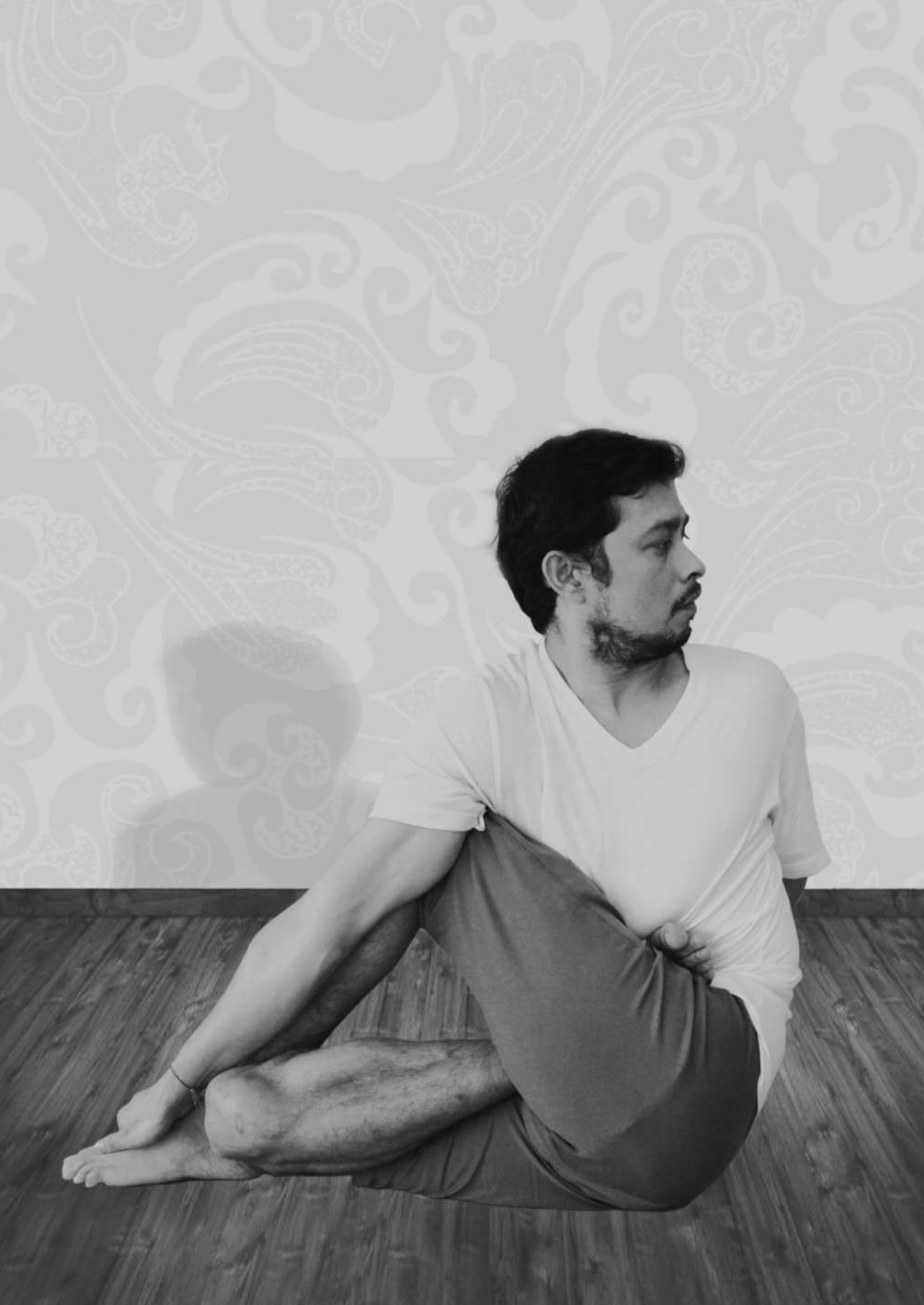 右脚放在靠近左大腿关节处,左脚从外围绕过右膝盖,抓住左脚,扭转身体。这就是玛司延德拉尊者(鱼帝尊者)提出的体位(Matsyendrasana,即扭转式)。(见图8)