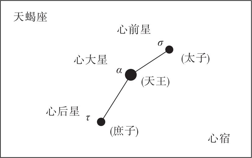 心宿为古代二十八宿之一,属东宫苍龙,共三星,依星家的说法,其中央大星代表天王(即皇帝),又名大火;前后星则分指太子及庶子(见图一)。心宿在星占学上不仅代表天子祈福祀神的明堂所在,且与荧惑的关系密切,被视为“荧惑庙”