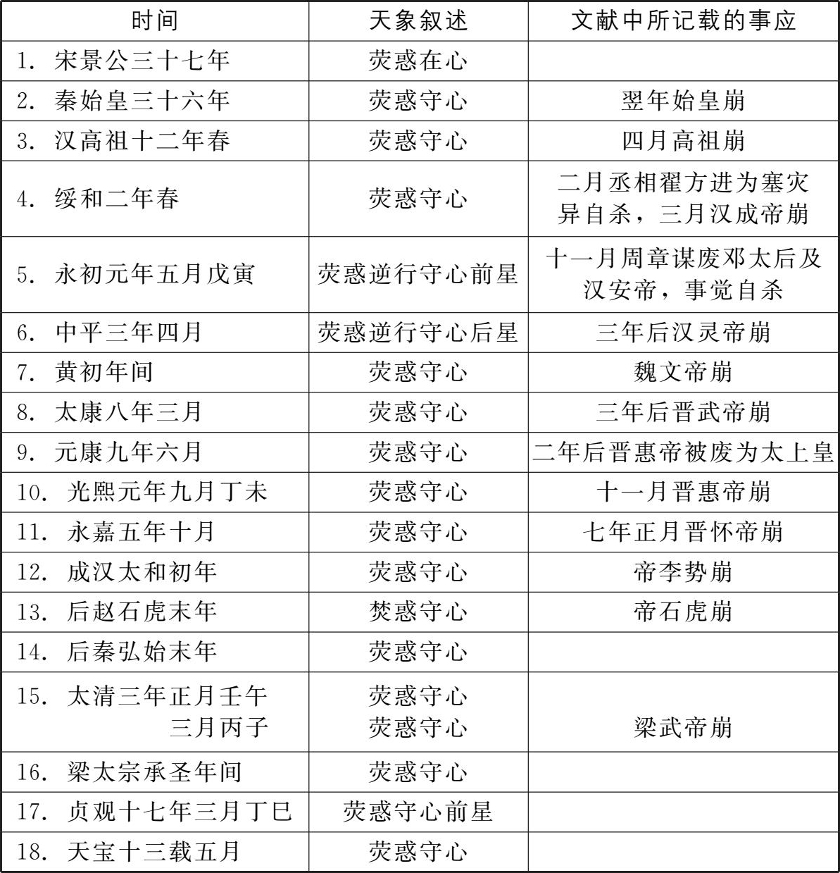 笔者在搜集、整理文献中各“荧惑守心”记录的过程中,曾使用台北“中央研究院”计算中心及历史语言研究所发展中的“二十五史全文资料库”,以电脑查阅了部分正史中涉及“荧惑守心”的记载共23次