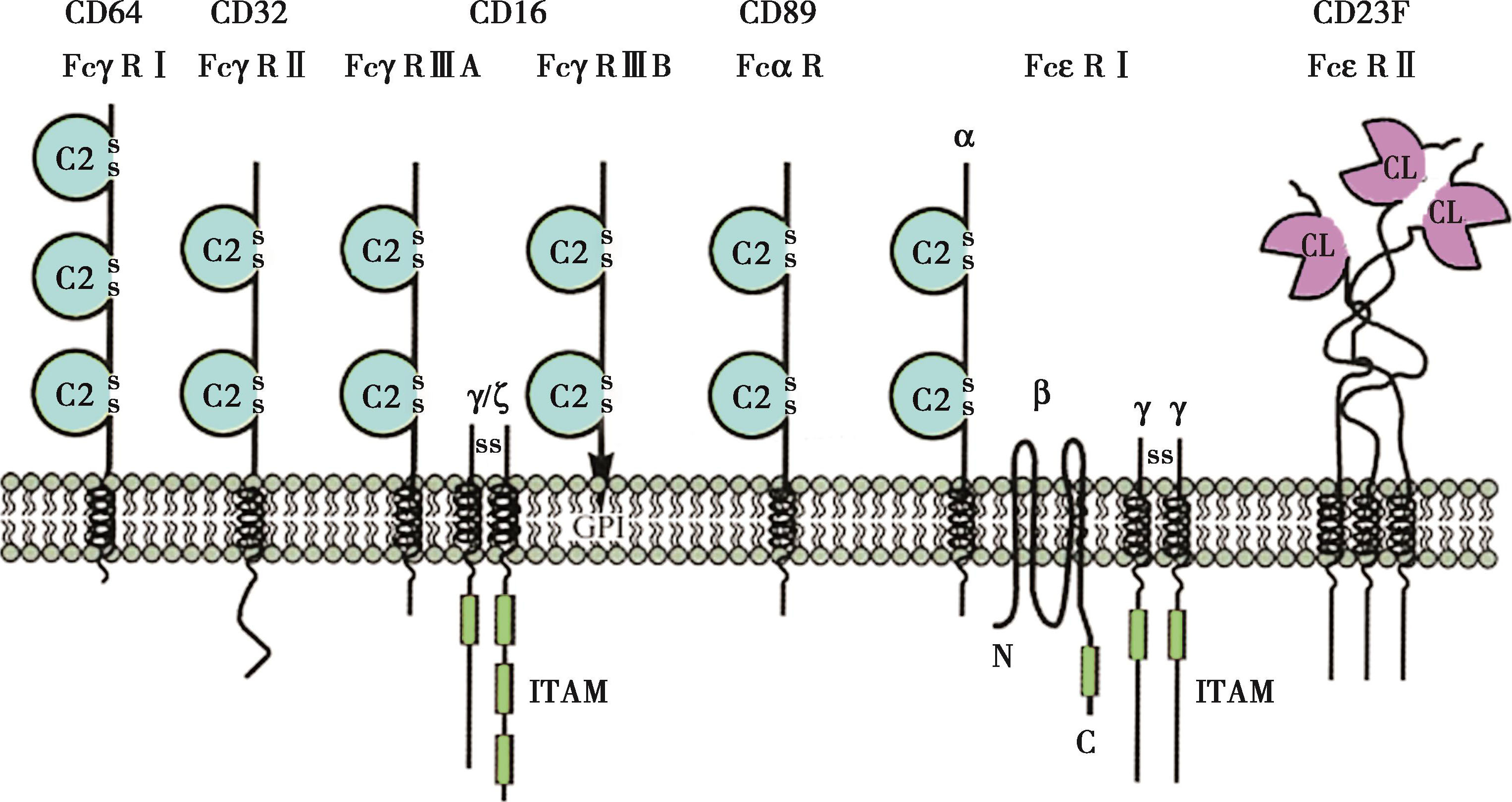 FcαR即CD89,为分子量60kD跨膜糖蛋白,属Ig超家族成员,胞膜外有2个C2结构域,为中亲和力受体(图4-7),主要表达于单核细胞、巨噬细胞、中性粒细胞等。中性粒细胞表面FcαR可结合血清型和分泌型IgA1和IgA2。FcαR介导吞噬细胞的吞噬作用、超氧产生、释放炎症介质以及发挥ADCC,上述作用需要FcRγ链参与。