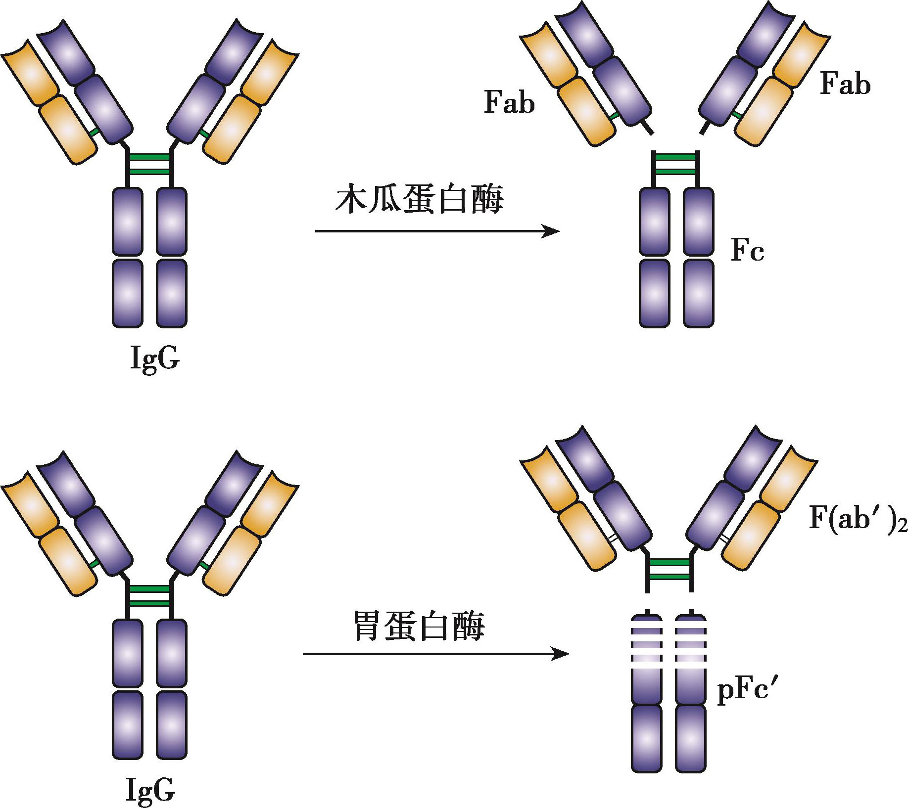 胃蛋白酶作用于IgG在铰链区连接重链的二硫键近C端一侧,可裂解产生1个F(ab') 2 片段和一些小片段pFc'。F(ab') 2 片段是由2个Fab及铰链区组成(图4-3),由于Ig分子的两个臂仍由二硫键连接,因此F(ab') 2 具有与完整的抗原结合活性,可同时结合两个抗原表位,故能发生凝集和沉淀反应。双价的F(ab') 2 与抗原结合的亲和力要大于单价的Fab。虽然F(ab') 2 与抗原结合特性方面同完整的Ig分子一样,但由于缺乏Ig中部分片段,因此不具备固定补体以及与细胞膜表面Fc受体结合的功能。由于应用F(ab') 2 时保持了结合相应抗原的生物学活性,又减少或避免了Fc段抗原性可能引起的副作用,因而在生物制品中有较大的实际应用价值。IgG的Fc段被胃蛋白酶裂解为若干小分子片段,被称为pFc',失去生物学活性。