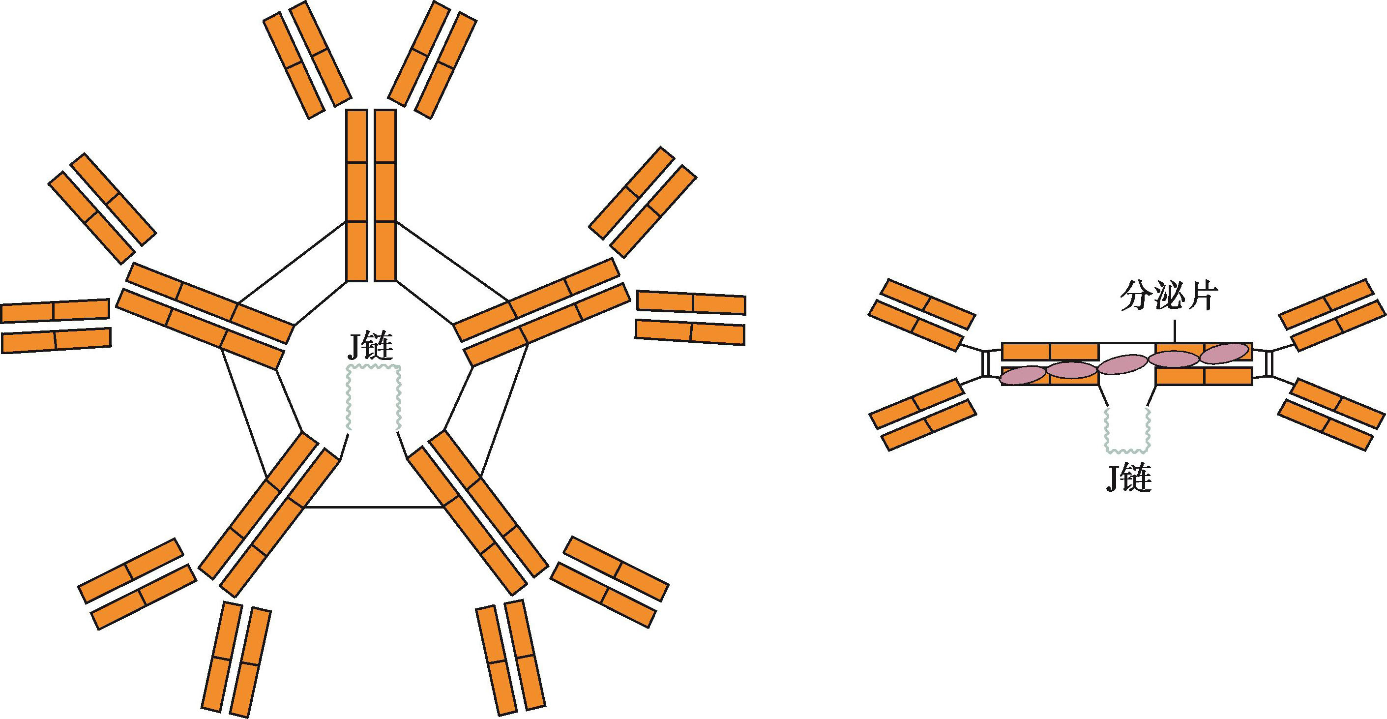 图4-4 J链(五聚体IgM)与分泌片(二聚体IgA)示意图