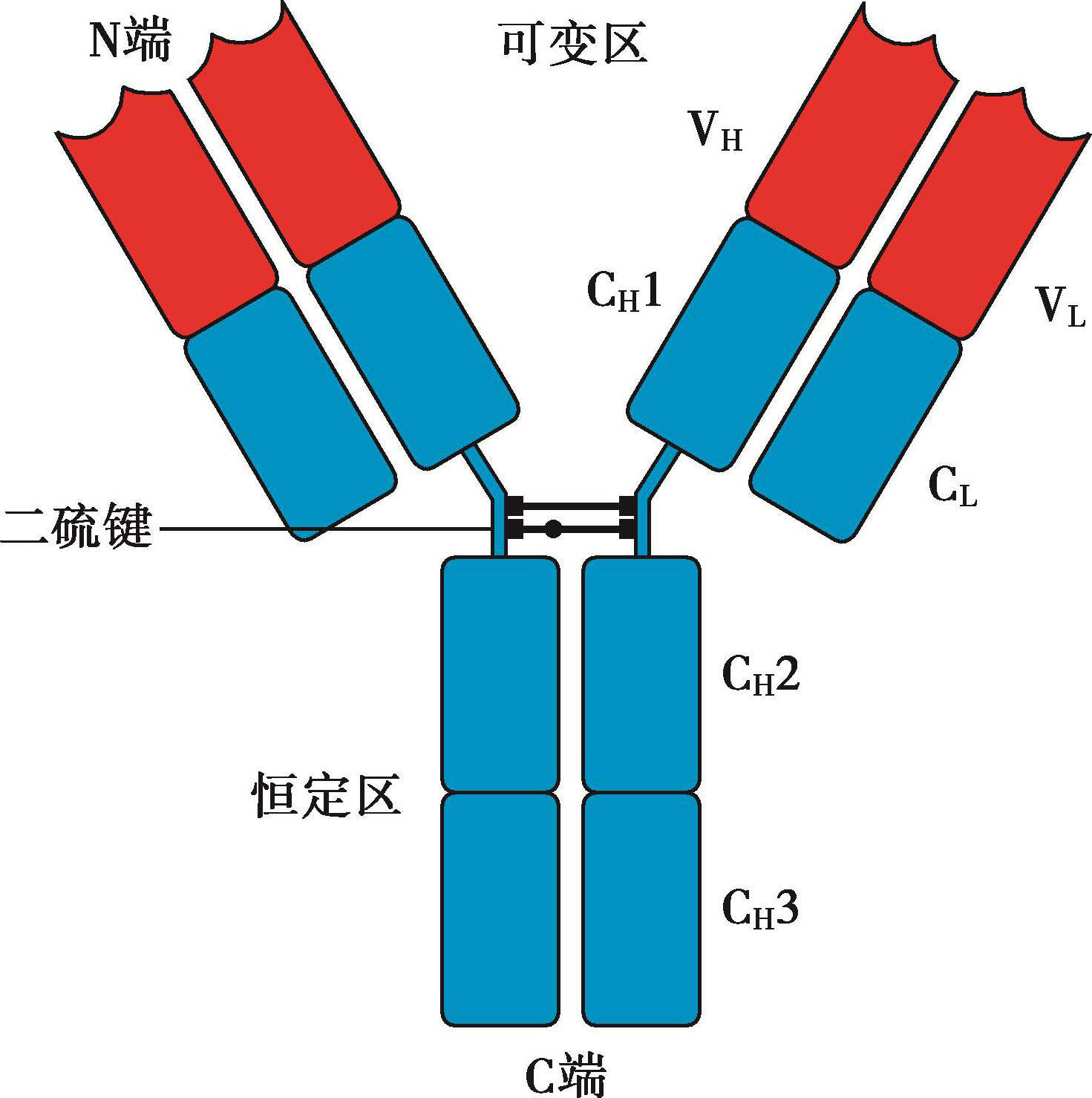 研究证明,所有Ig的单体结构均非常相似,由英语大写字母Y形状的四肽链组成,即由2条相同的分子量较小的肽链称为轻链(light chain,LC)和2条相同的分子量较大的肽链称为重链(heavy chain,HC)组成,重链之间和重、轻链之间是由二硫键连接(图4-1)。Ig单体中四条肽链两端游离的氨基或羧基的方向是一致的,分别命名为氨基端(N端)和羧基端(C端)。