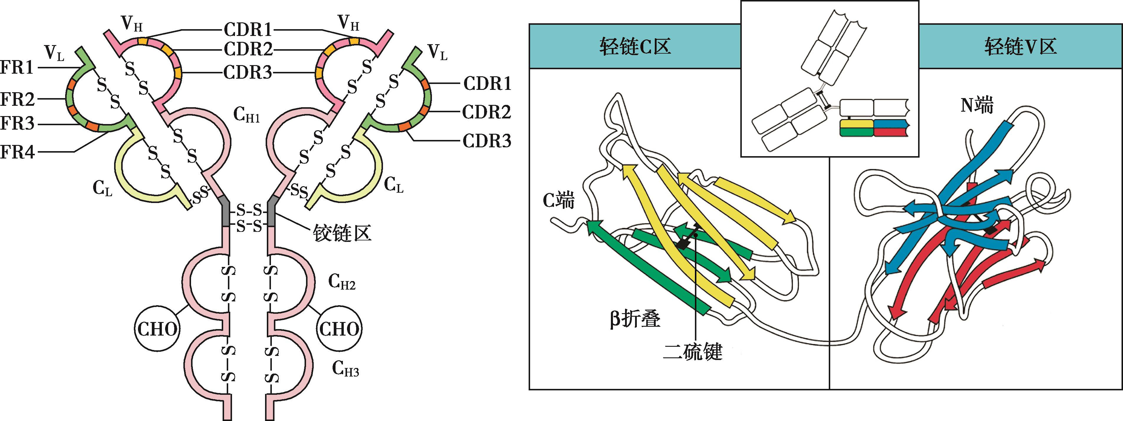 晶体结构分析显示,Ig各结构域是由多肽链折叠形成的球状结构,形成免疫球蛋白折叠(immunoglobulin fold)。每个结构域的大小约为4nm×2.5nm×2.5nm,形成两个反向平行的β片层(anti-parallelβsheet)。可变区结构域的β片层结构由9股(一层4股、另一层5股)组成,恒定区的结构域则由7股(一层3股、另一层4股)组成。两个β片层中心的两个半胱氨酸残基由一条链内二硫键连接,使结构域牢固稳定。总观起来,形成“β桶状”结构或“β三明治状”结构(图4-2)。