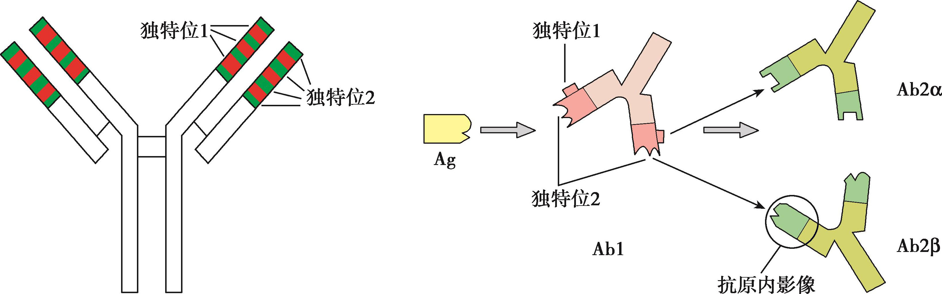 独特型(idiotype)是指同一个体不同B细胞克隆产生的Ig分子所特有的抗原标志,其表位又称为独特位(idiotope),主要存在于V区。当B细胞发生克隆扩增时,其独特型在异种、同种异体甚至同一个体内均可刺激产生相应抗体,即抗独特型抗体(图4-6)。由抗独特型抗体组成的独特型网络在免疫调节中发挥作用。