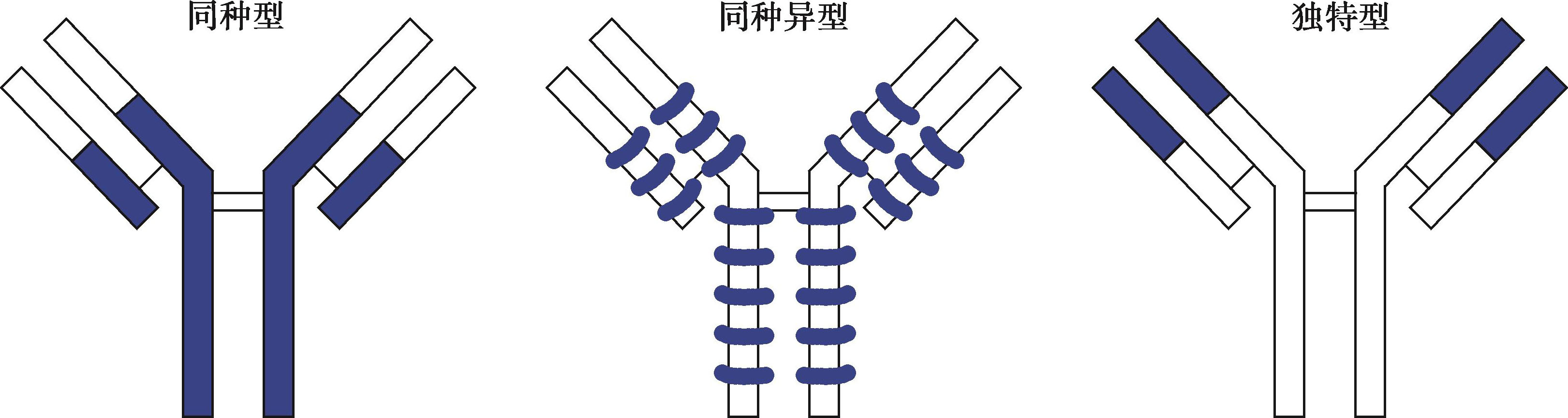 机体针对不同抗原表位通常产生特异性不同的抗体,同时由于重链C区的类别转换,产生的抗体的型别可有1~5种之多,而抗体轻链的型别也有2种。而且即使是一种抗原表位也可诱生不同类型的抗体;因此,抗原免疫机体产生的各种类型的免疫球蛋白(抗体)呈现结构和功能的异质性。免疫球蛋白具有双重特性,既可作为抗体与抗原特异性结合,同时又可作为蛋白质抗原,在特定条件下激发免疫应答。根据Ig分子抗原决定簇的不同部位以及在异种、同种异体或自体中产生免疫反应的差别,可把Ig的抗原性分别称为同种型、同种异型和独特型(图4-5),均可诱导特异性抗体(抗抗体),从而表现为不同的血清型。
