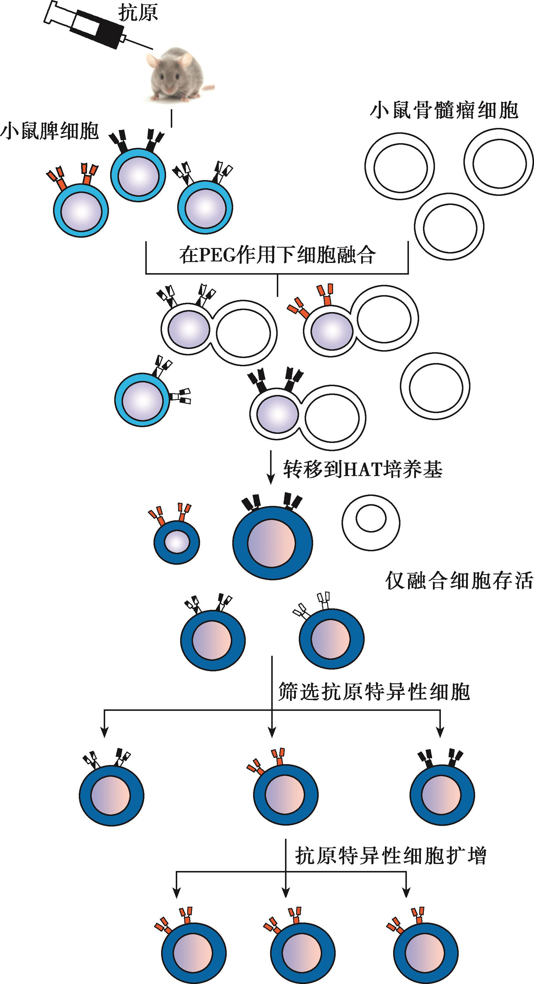 制备单克隆抗体的理想方法是获得只针对单一表位的B细胞克隆,使其在体外扩增并分泌抗体。然而,分泌抗体的浆细胞在体外的寿命较短,也很难培养。1975年,Kohler和Milstein克服了这些困难,建立了体外细胞融合技术,将抗原免疫过的小鼠脾细胞与骨髓瘤细胞融合,获得的杂交瘤细胞具备了既能分泌特异性抗体又能够长期存活的特性(图4-8)。现在,通过杂交瘤细胞技术,我们已经大规模地制备出高特异性的克隆抗体,已广泛应用于疾病的诊断、抗原或蛋白的检测和鉴定、疾病的被动免疫治疗和生物导向药物的制备等。