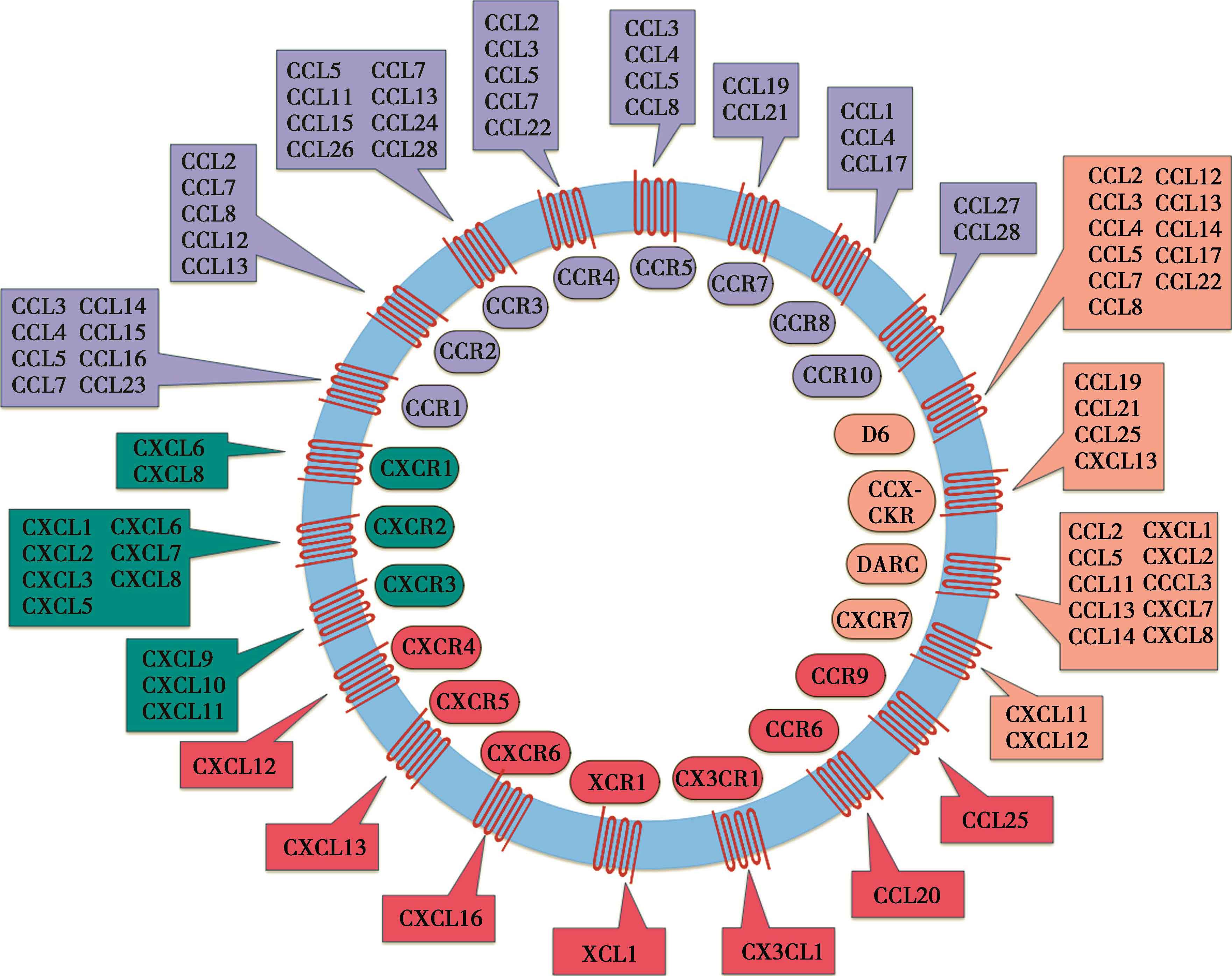 1998年国际药理学会命名委员会将趋化因子受体与配体分为四类,并进行了标准命名,分别用CC、CXC、CX3C后面加上R和一个数字来表示,目前已发现的功能性受体包括 CCR1~11、CXCR1~6、CX3CR1、XCR1~2。这一家族的受体是G蛋白偶联受体,由七个疏水性的跨膜区组成。当受体与相应的配体结合后,经偶联GTP结合蛋白引发钙内流信号,导致胞质内钙离子浓度增高。信号通路转导的具体过程为趋化因子与受体结合后引起受体构象改变,激活偶联的G蛋白形成Gα-ATP复合物并与βγ亚基分离,激活磷脂酶C(PLC)、磷脂酰肌醇3-激酶(phosphoinositide 3-kinase,PI3K)及酪氨酸激酶等,产生三磷酸肌醇(inositol-1,4,5 trisphosphate,IP3),促使细胞外钙离子内流和细胞储存钙离子释放,激活肌凝蛋白和肌动蛋白,刺激细胞骨架发生改变,肌动蛋白丝聚合、收缩,细胞的移动性增加,同时这些信号也促使整合素发生构象改变,增加其与配体的亲和力,在其协同作用下,细胞发生定向迁移、聚集。