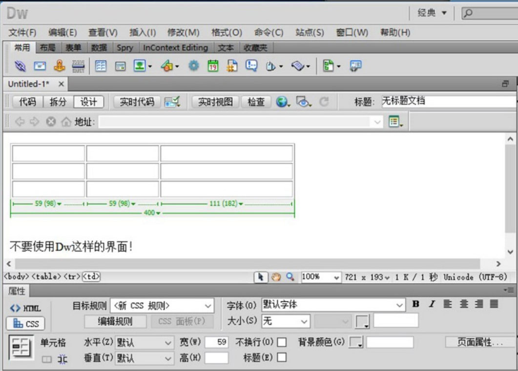 这里有个情况有必要跟初学者说明一下。如果选择了Dreamweaver作为开发工具,一定不要使用它的界面操作的方式来开发网页,如图2-1所示,这种开发方式已经被摒弃很久了。