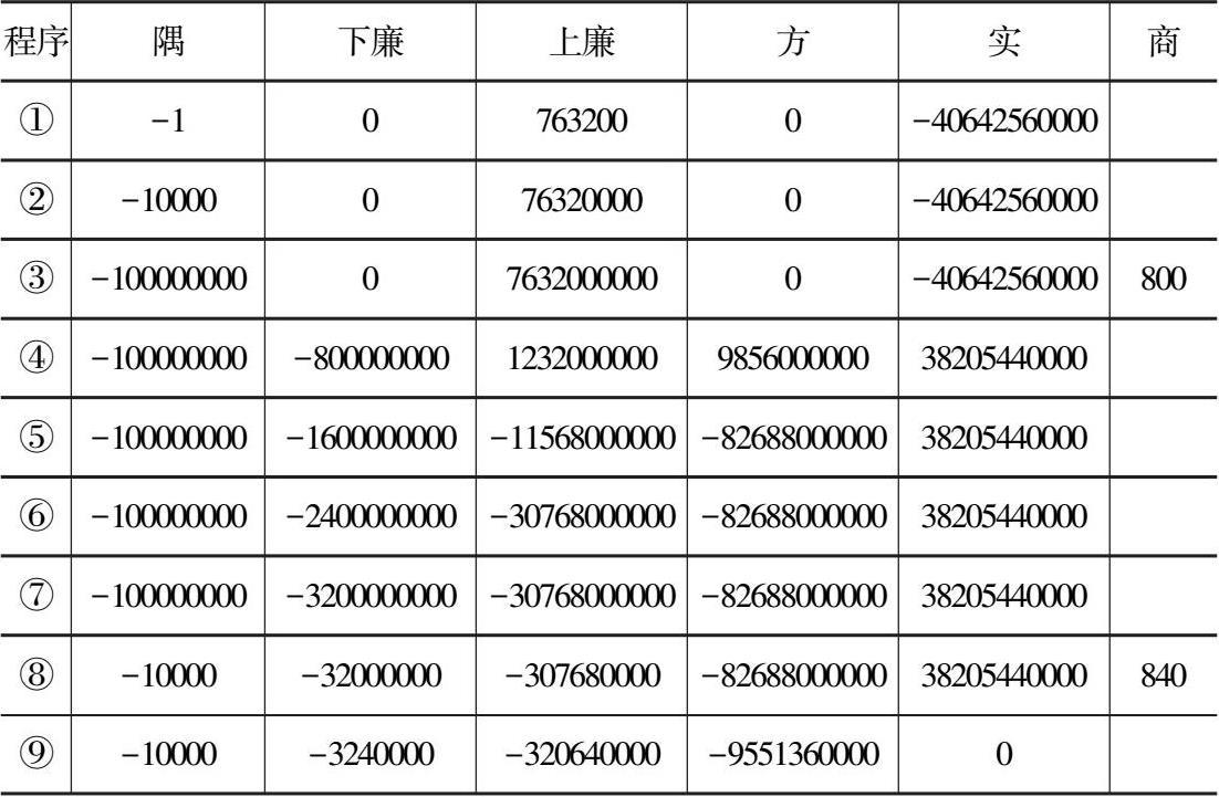 当求得8< x 1 <9,确定出第一位数为8之后,程序③至⑥就是用增乘方法的步骤进行,当经 x 2 = x 1 -8的代换后程序⑦所应得的新方程是:
