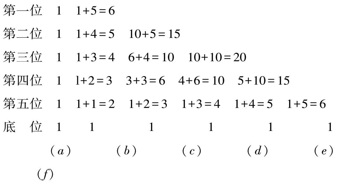 ④再如上进行升增,但分别到第三位得20,到第四位得15,第五位得6止,如图中( d )、图中( e )、图中( f )。