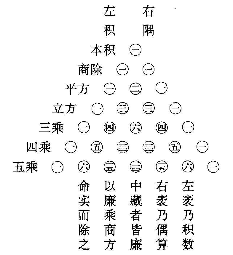 实际也是利用了展开式右端的四个系数1、3、3、1。显然,同样的步骤对于任意次幂的开方都是适用的。因此,找出二项式展开式中的系数的规律就可以利用它来进行对高次幂的开方。中国数学史上,较早认识这一点,并给出二项式展开式中的系数规律的是北宋数学家贾宪。