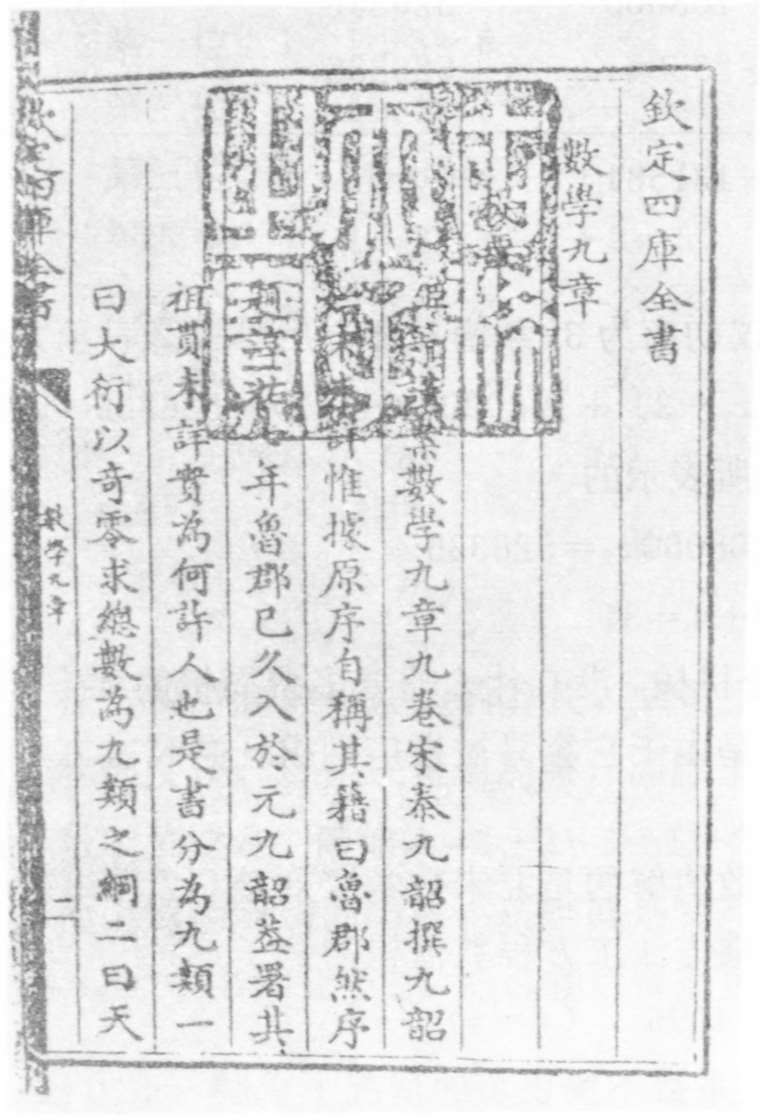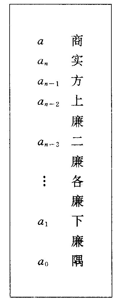 的方程,秦九韶采用古代在开方中所使用的列筹方法:将商,即根置于筹式的最上方,然后依次列常数项(实)、一次项、二次项等各项的系数(“廉”),最下一层放置最高次项系数——“隅”。