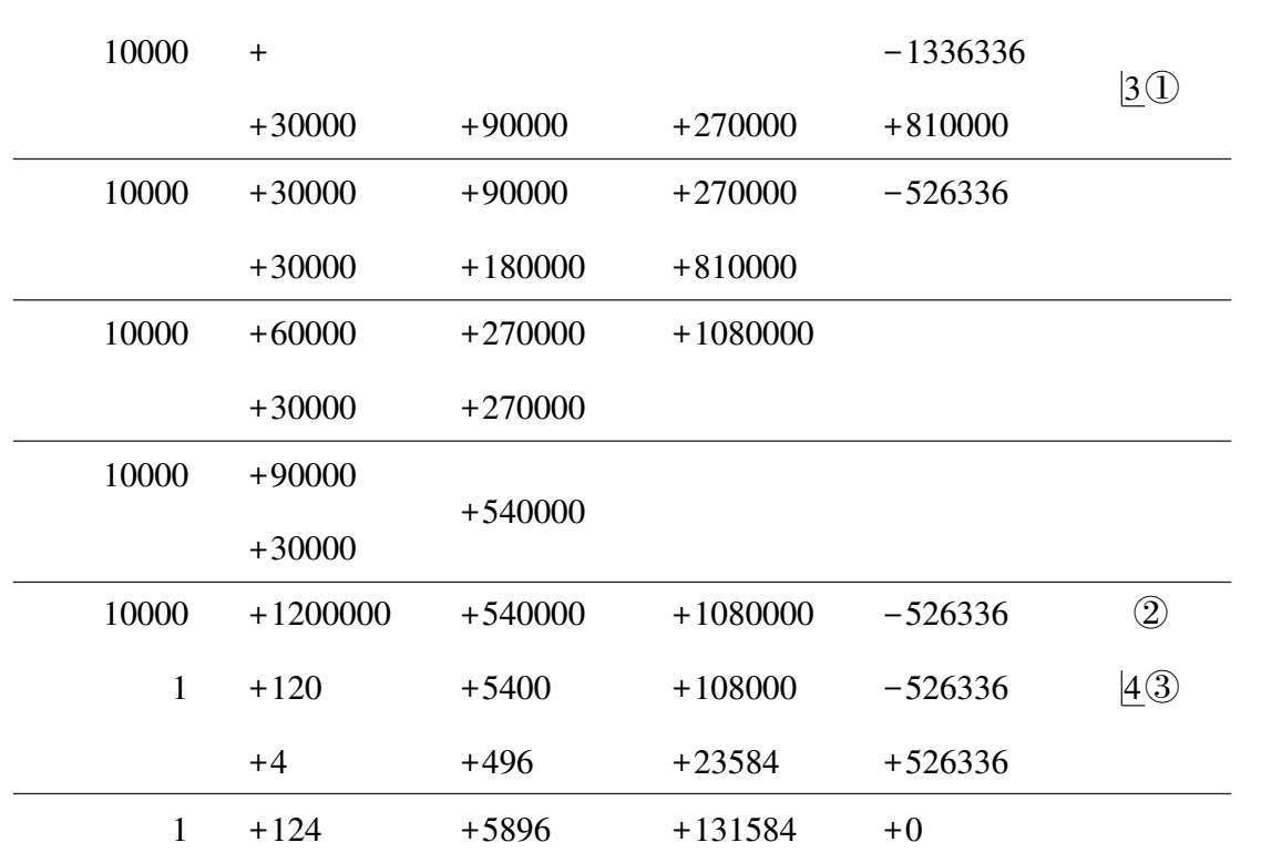 秦九韶在列出方程的筹式后,依次用21个筹算图式来详细说明解方程的每一个步骤。下面我们改用阿拉伯数字并用横式抄录其主要图式如下表所示。(摘自沈康身:增乘开方法源流,载《秦九韶与数书九章》一书,北京师范大学出版社,1987年)
