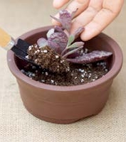 3.选择合适的位置摆放,一边用小铲加土,一边轻提植物。 |