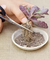 2.轻轻地将根部所有土壤去除,用剪刀剪去所有老根和枯叶。 |
