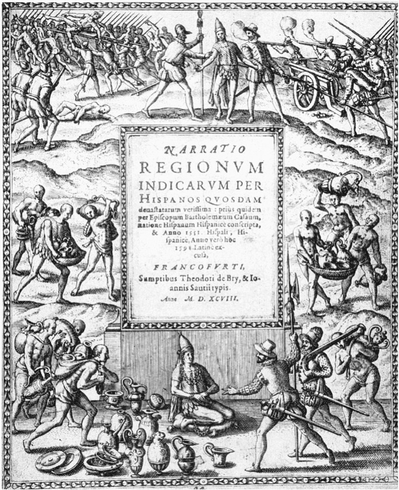 图152 西班牙神父巴托洛梅·德拉斯·卡萨斯为美洲原住民辩护,抨击西班牙人的野蛮行径。他的著作记述了西印度群岛美洲原住民遭受的不人道的残酷待遇。