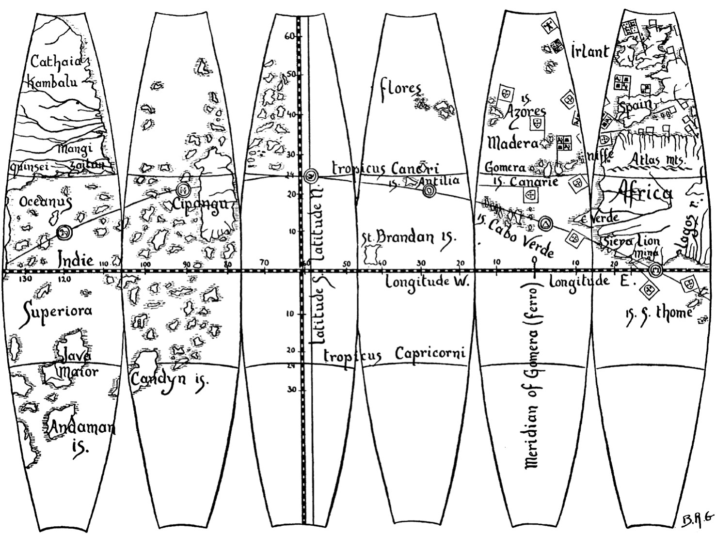 图146 这幅地图是纽伦堡地理学家马丁·贝海姆所绘,反映了1492年时哥伦布所了解的世界。贝海姆制作了世界上第一个地球仪,这幅地图再现了这个地球仪的海洋部分。哥伦布从加那利群岛(右数第二列的Canarie)出发,他希望能首先登陆日本(左数第二列中的Cipangu)。哥伦布在圣萨尔瓦多岛登陆时,误以为是登上了日本的外岛。当他到达古巴时,他认为自己抵达了日本。