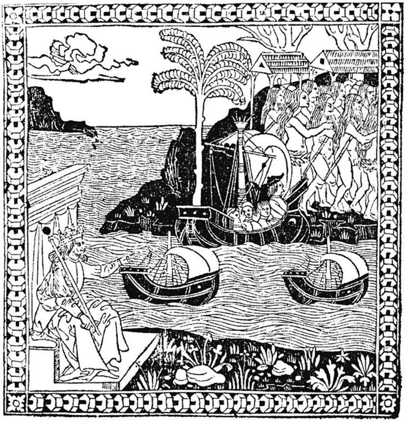 图145 这幅木版画是1493年一本小册子的封面,它可能是欧洲最早描绘哥伦布到达美洲的画作。图中,坐在左边的西班牙国王斐迪南指挥哥伦布和他的三艘船驶向一座岛屿。几乎赤身露体的土著(画得比欧洲人高大)似乎正在逃离。