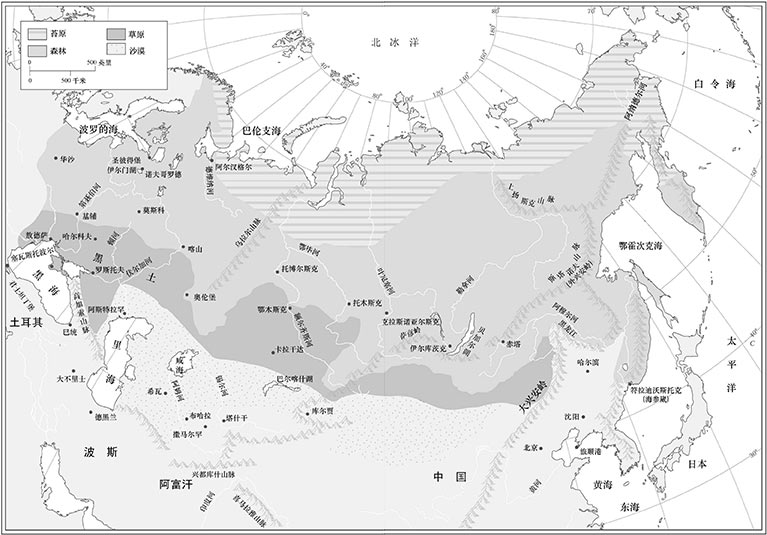 在森林地带的南部边缘,林木变得稀疏,树木也越来越矮小,直到完全让位于没有树木的开阔大草原。这里有历经千百年堆积而成的腐殖质肥沃黑土地。如今这里是俄国的粮仓,但过去几个世纪里它一直是痛苦和不幸的源头。西伯利亚大草原是亚欧大陆中部骑马游牧民族的家园,每当这些游牧民族崛起,就会沿着阻力最小的路线出击,有时向西进犯中欧,有时向东进犯中国。脆弱的东欧俄罗斯人更是频繁受到游牧民族的袭击。森林地带的斯拉夫农民与草原上的亚洲游牧民族持续不断的冲突成为俄国历史的一大主线。起初游牧民族占据上风,蒙古人统治俄罗斯地区长达两个世纪之久。但森林斯拉夫民族最终变得强大,不仅赢得了独立,还在亚欧大平原上扩张。