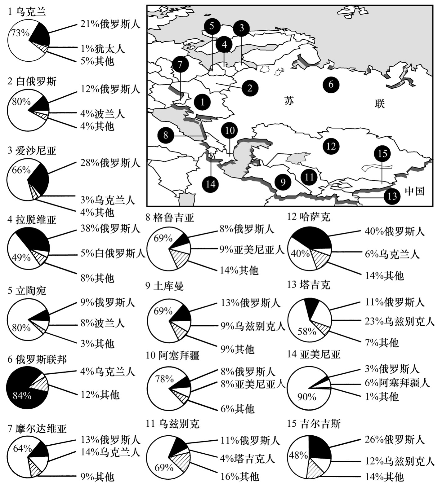 图165 苏联加盟共和国的民族成分。由图表可见,苏联15个加盟共和国中,各加盟共和国的主体民族在人数上占优。因此,当苏联被独联体取代,这些民族要求并赢得了独立国家地位(《洛杉矶时报》,1990年1月28日。授权使用)。注:由于四舍五入的原因,每个加盟共和国的数据不一定等于100%。