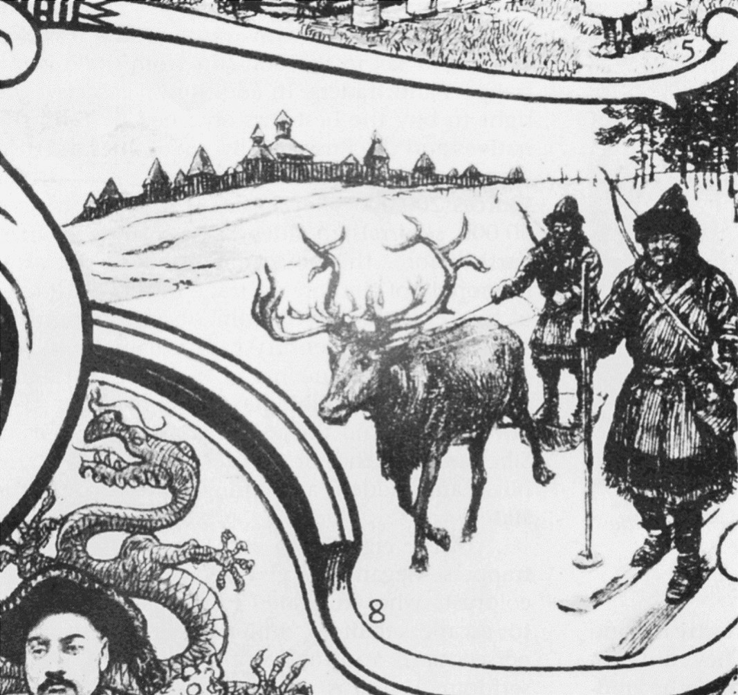 图163 西伯利亚部落民。他们出行靠驯鹿和滑雪板。图中远景是一座俄罗斯城堡。