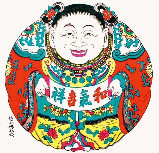 不管是姑苏桃花坞年画,还是潍县年画,现在我们能看到的年画中“一团和气”的形象大多如此。好几个年画产地都有《一团和气》图,桃花坞的最为著名——它刻画人物讲究,不仅外形讲究形似,而且神韵上传神。滩头和潍县等地年画中也有《一团和气》,但都显得程式化,不如桃花坞年画《一团和气》中的胖子生动可爱。