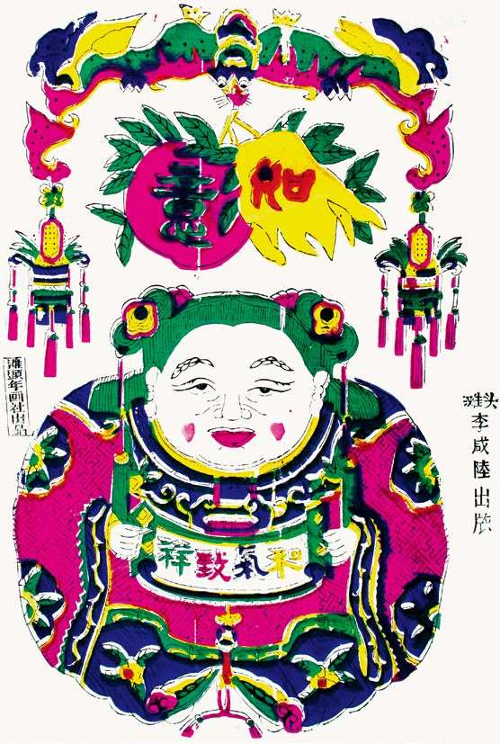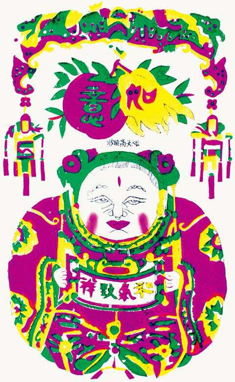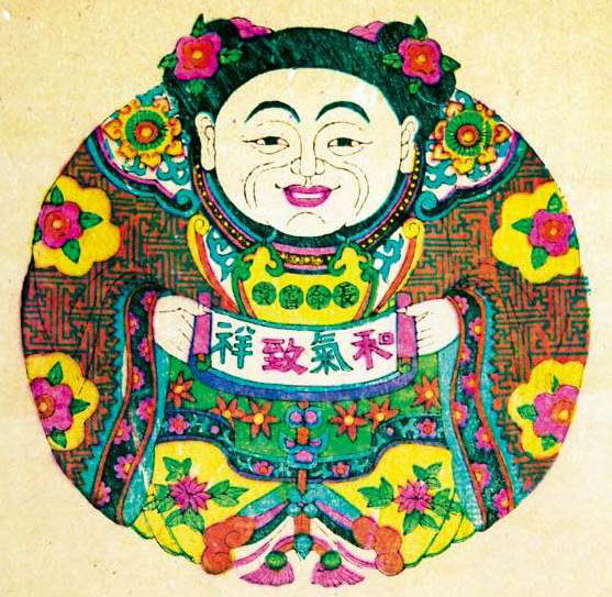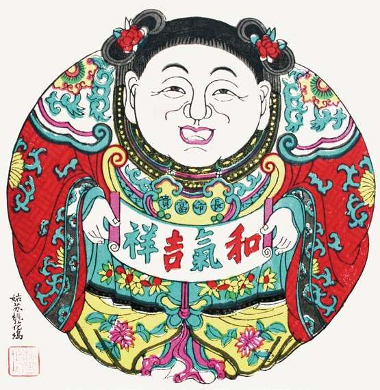 一张笑嘻嘻的圆脸,细眯的眼睛神气十足,透出洞穿一切的智慧。张开嘴巴的形象像极了人们所谓“笑口常开”的表情,显示出吐纳四方的豪迈。肉嘟嘟的双手捧着“和气吉祥”书卷,胸前的金锁上刻着“长命富贵”,红、黄、绿这些在中国传统文化中有着美好寓意的颜色点染了她的服饰,烘托出年画“一团和气”的形象。这个形象仿佛是随着遥远的北方村烟徐徐而来,带着泥土、热炕、水饺的气息,质朴、喜庆;又仿佛从精致的南方小河中缓缓漂来,带着十里桃花、春风,高贵、和谐。