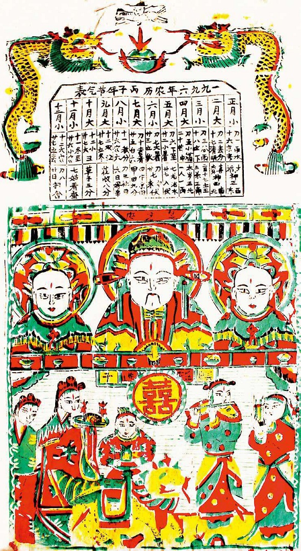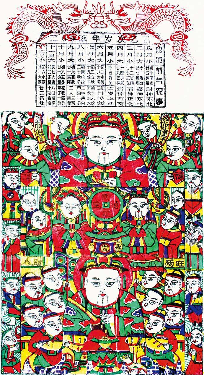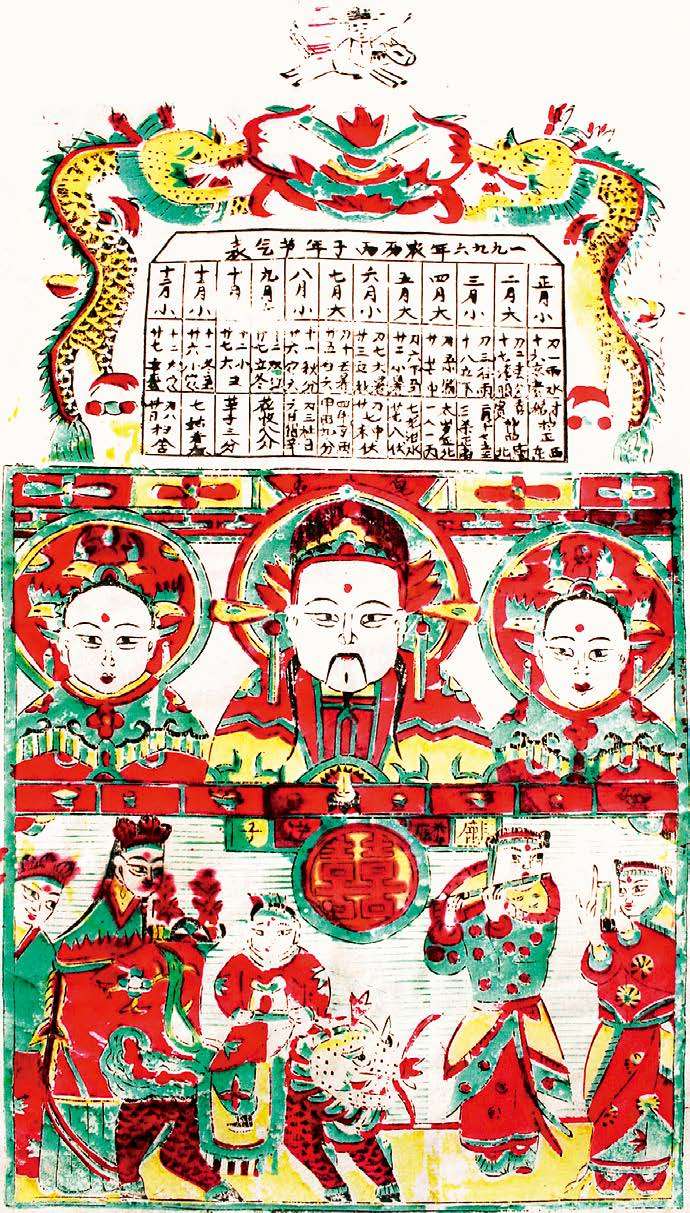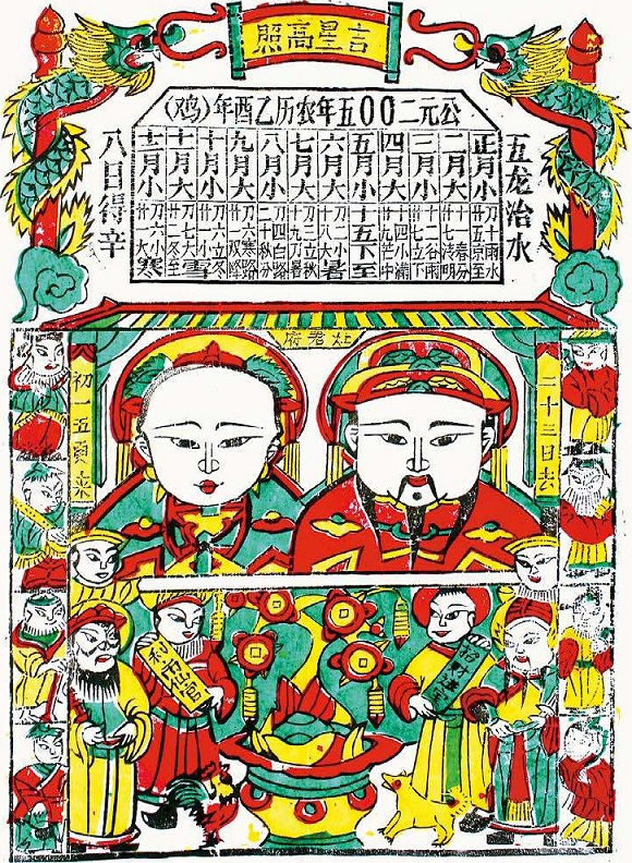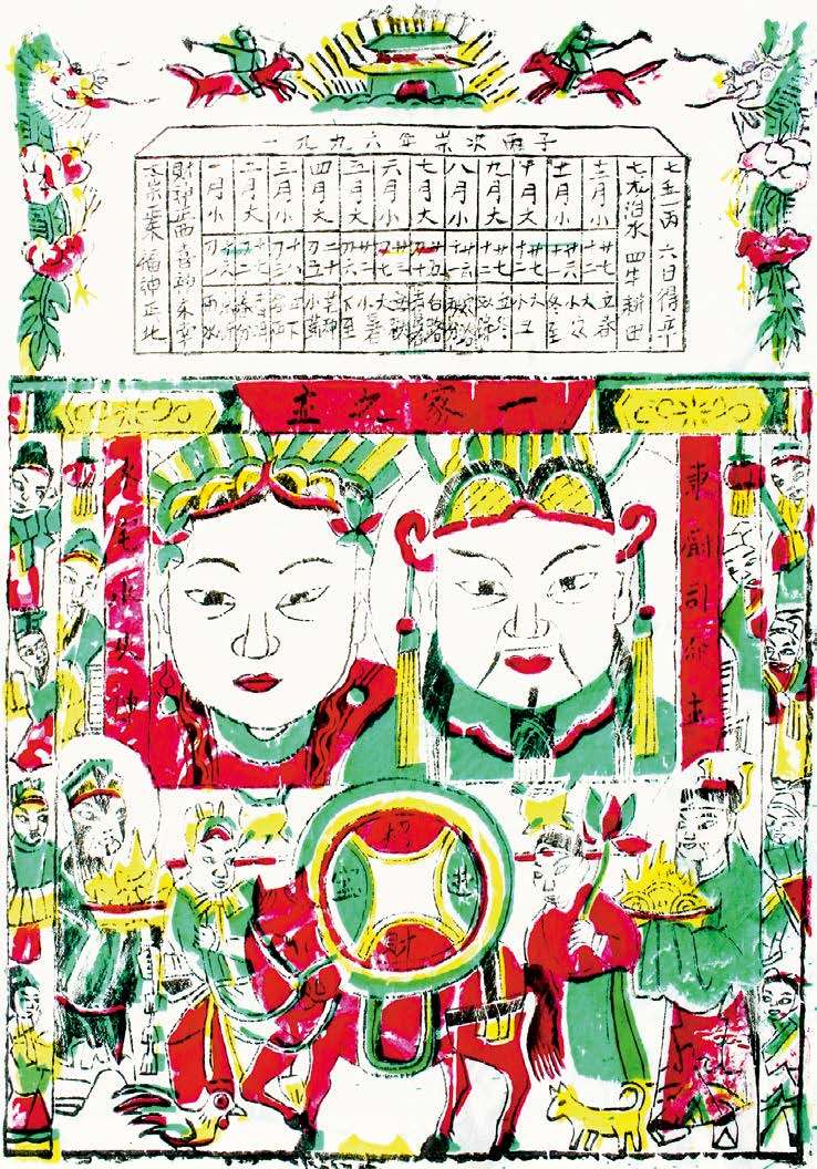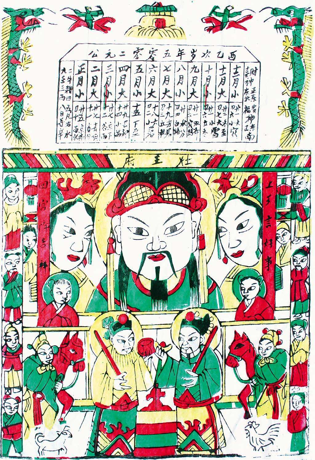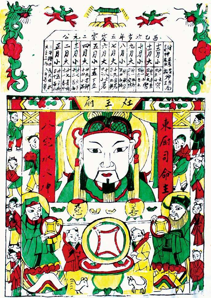 有的灶王爷像上部还印有这一年的日历,两旁写上“东厨司命主”“人间监察神”“一家之主”等文字,以表明灶神的地位。总之,都是以保佑全家老小平安为主题。