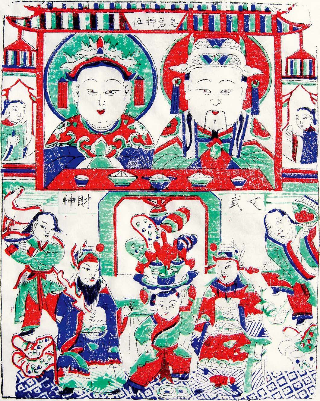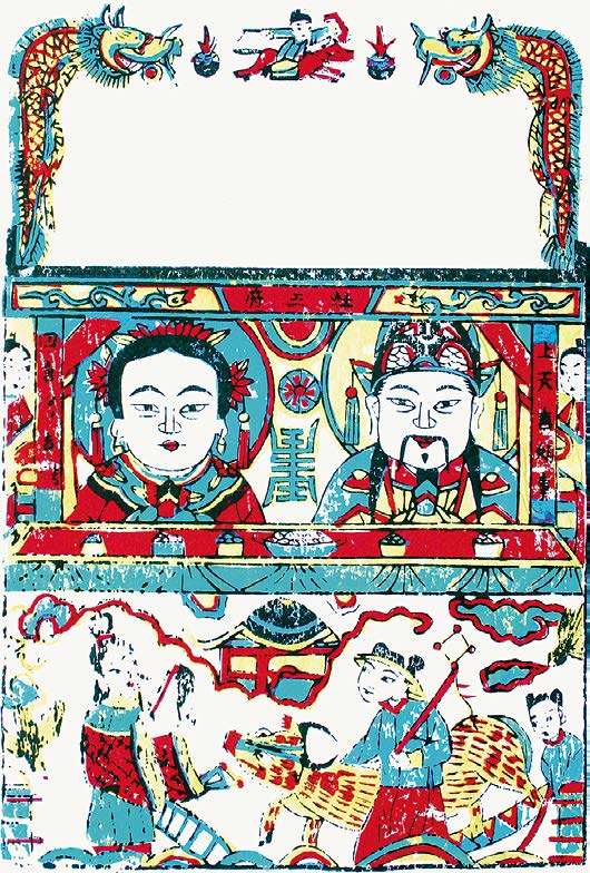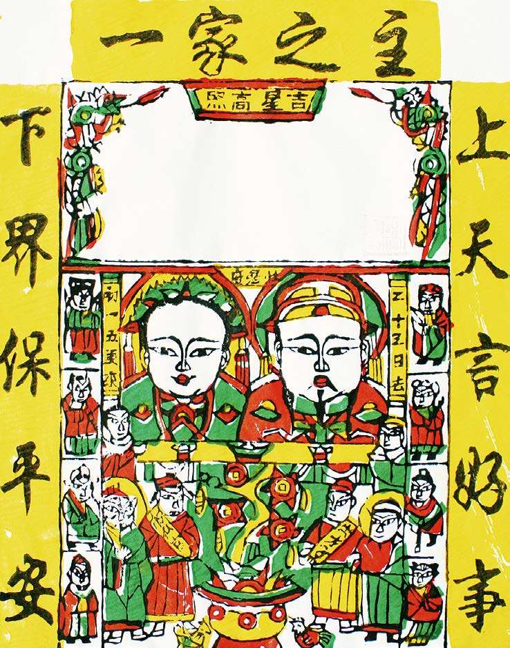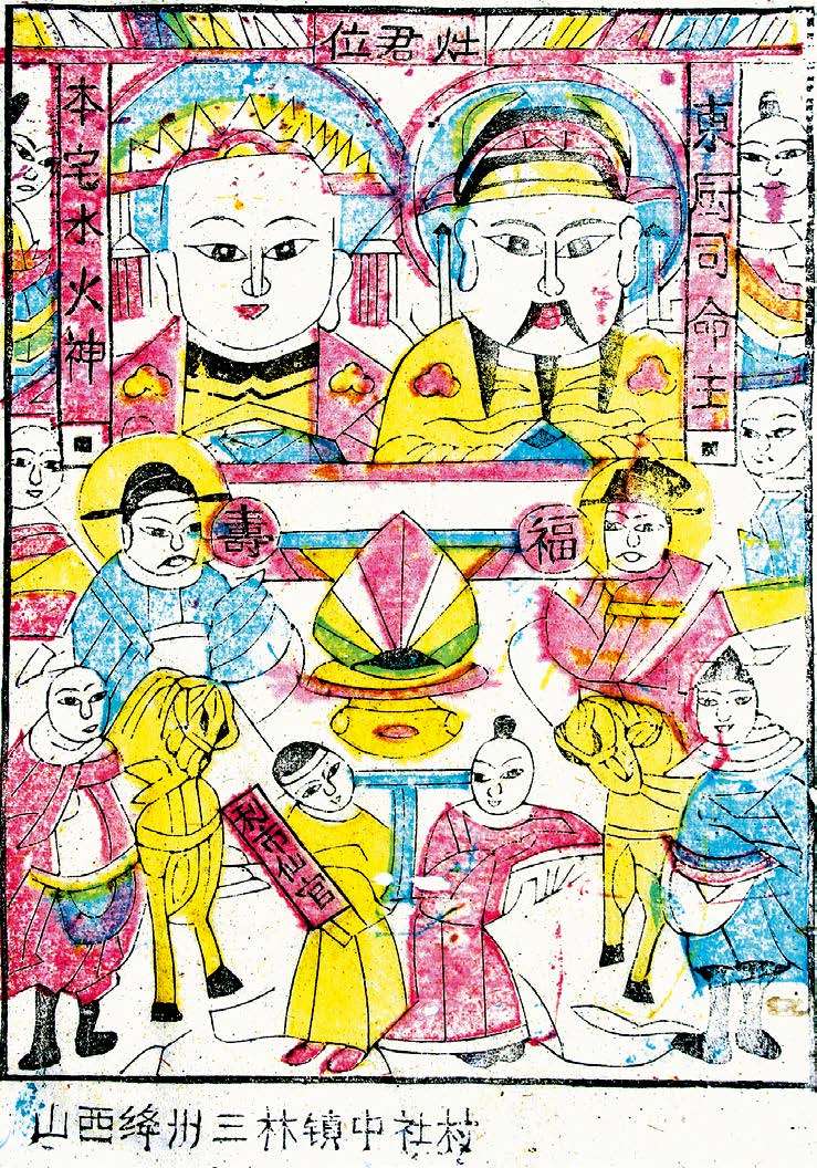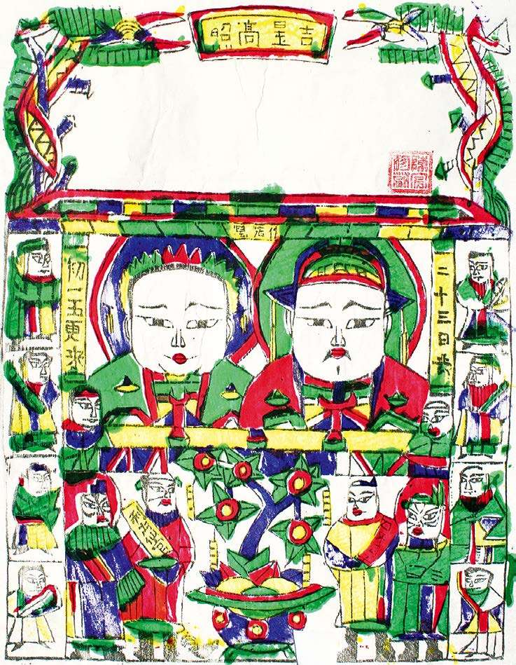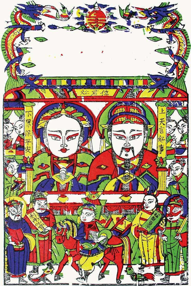 灶王爷是木版年画中表现最多的题材,也是印制量最大的年画,甚至在木版年画三大基地之一的杨家埠有一句话:“先有灶王爷,后有杨家埠。”因杨家埠就是以印灶王爷年画出名,每年腊月,家家户户印灶王爷年画,销往全国各地。