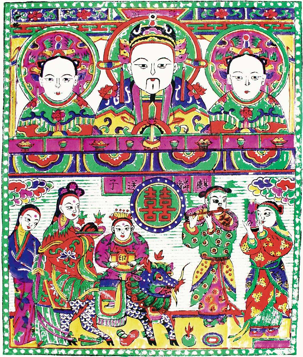 三段式的灶王图采用阁楼式构图,画面层次丰富、构图饱满,装饰性很强,同时体现了多子多福的吉祥寓意。