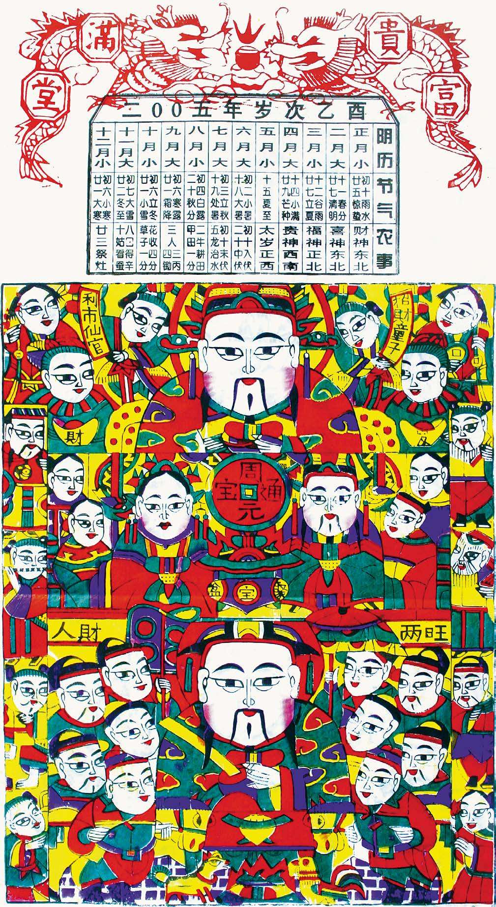 年画图中的灶王有多种形式,其中较为复杂的是三段式的灶王图。上层是赐福财神和童子,中层为灶王夫妇及侍从,下层是宅神,两边有文官、武将和侍从。最下边有聚宝盆和鸡犬。加上画幅两侧的八仙人物,全图通常有32人。
