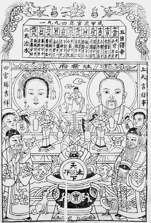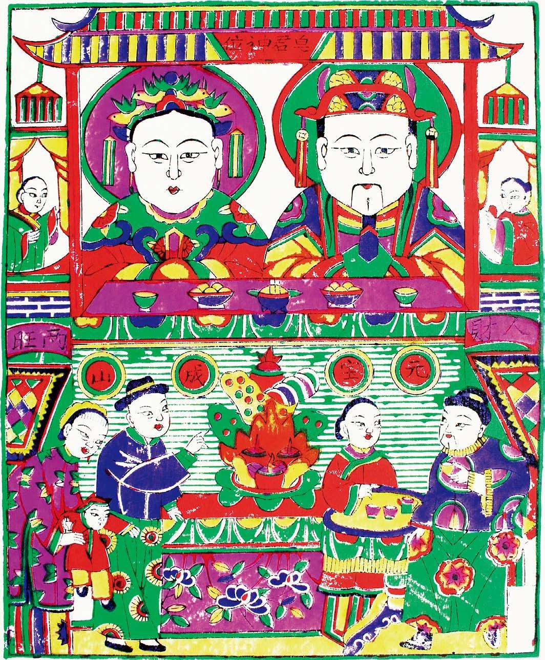 灶王年画有多种,分为“马上灶”“马下灶”“金钱灶”“天门灶”“太平灶”“双龙灶”“双奶灶”“八仙灶”等。