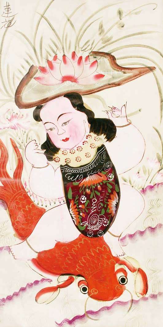 从娃娃图的搭配物品,也可以看出源于生殖繁衍崇拜的形式。与娃娃搭配最多的是莲花,莲花取其谐音“连”“连连”“连理”,莲花的果实莲蓬又多子,因此,各种莲花童子的年画在各地年画中比比皆是,如潍县年画中的《莲年有鱼》,凤翔年画中的《吉庆有余》,杨柳青年画中的《连生贵子》等,都表现了胖娃娃和莲花的美好形象和吉祥寓意。