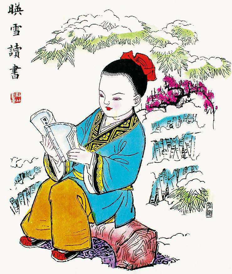 孙康由于家境贫寒没钱买灯油,晚上不能看书。一天半夜,他从睡梦中醒来,发现窗缝里透进一丝光亮。原来,那是大雪映出来的,可以利用它来看书。于是他来到屋外,不顾寒冷,看起书来。手脚冻僵了,就起身跑一跑,同时搓搓手指。此后,每逢有雪的晚上,他就不放过这个好机会,孜孜不倦地读书。正是他这种苦学的精神,使他成为饱学之士。