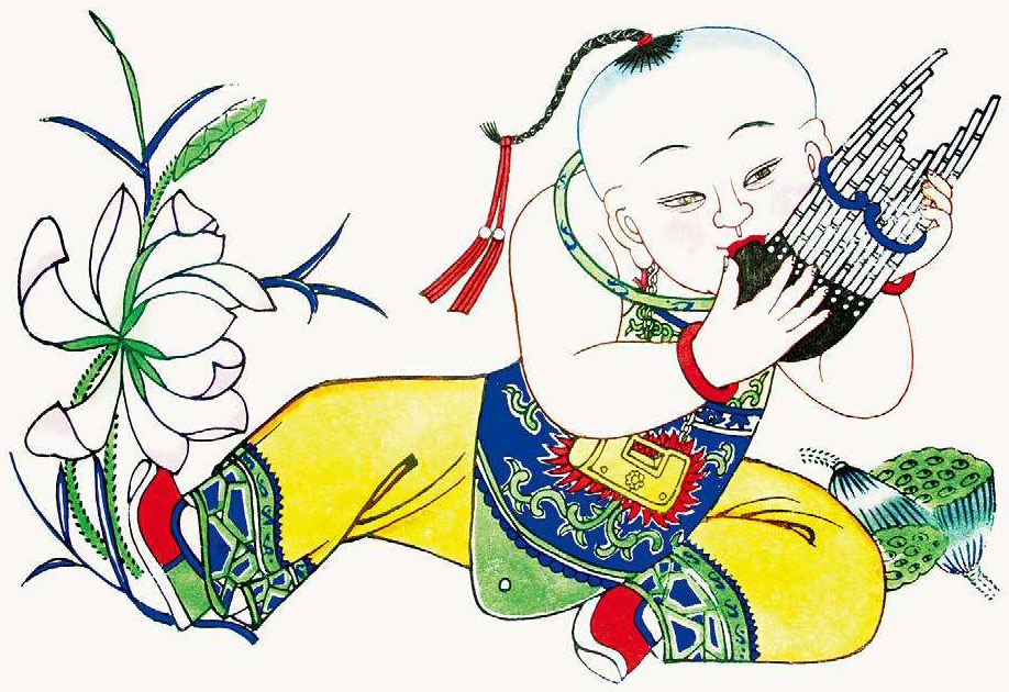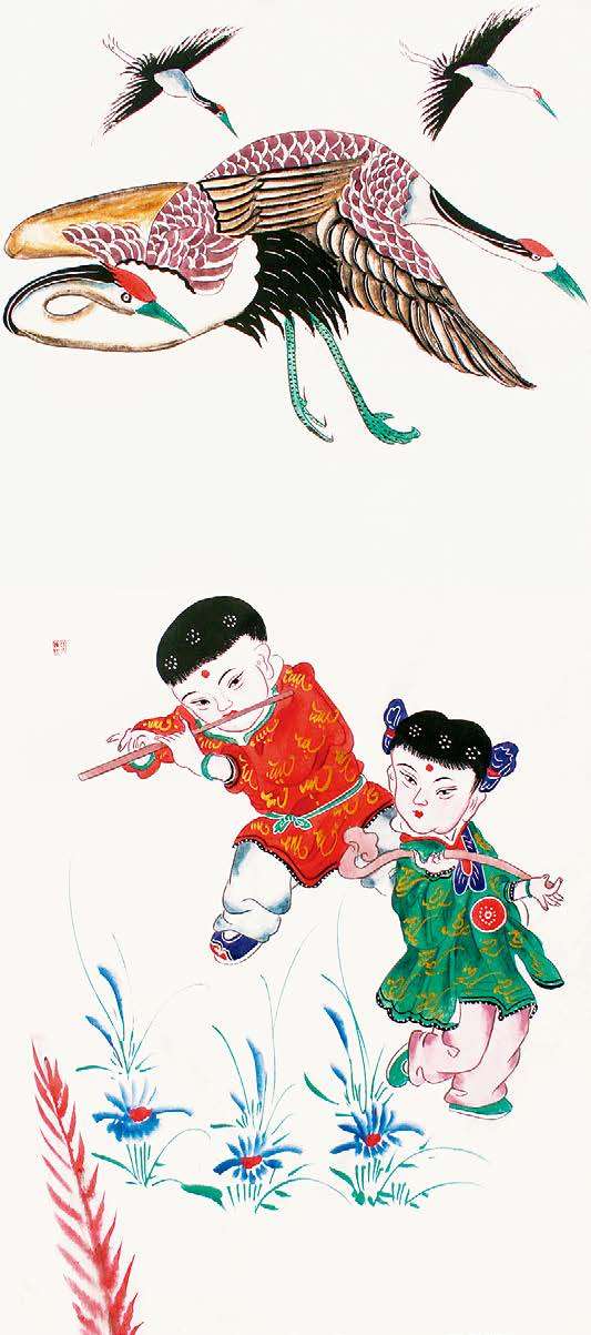 古有吹箫引凤的传说,此年画将吹箫引凤变化为吹箫引鹤,同样表达吉祥寓意。